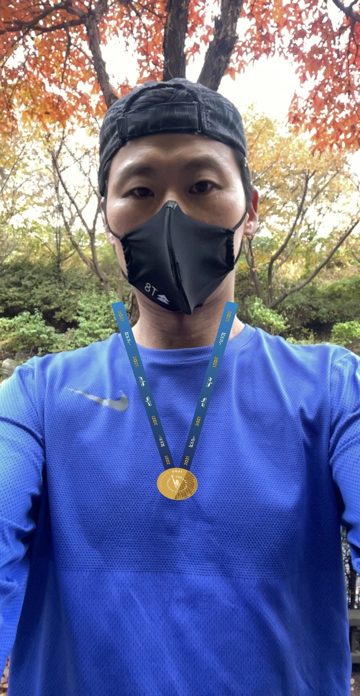 온라인으로 완주 기록증을 다운받고, 뉴욕마라톤 앱에는 완주 메달을 걸고 셀카를 촬영할 수 있는 신박한 기능이 있어서 정말 오랫 만에 셀카를 찍었다.