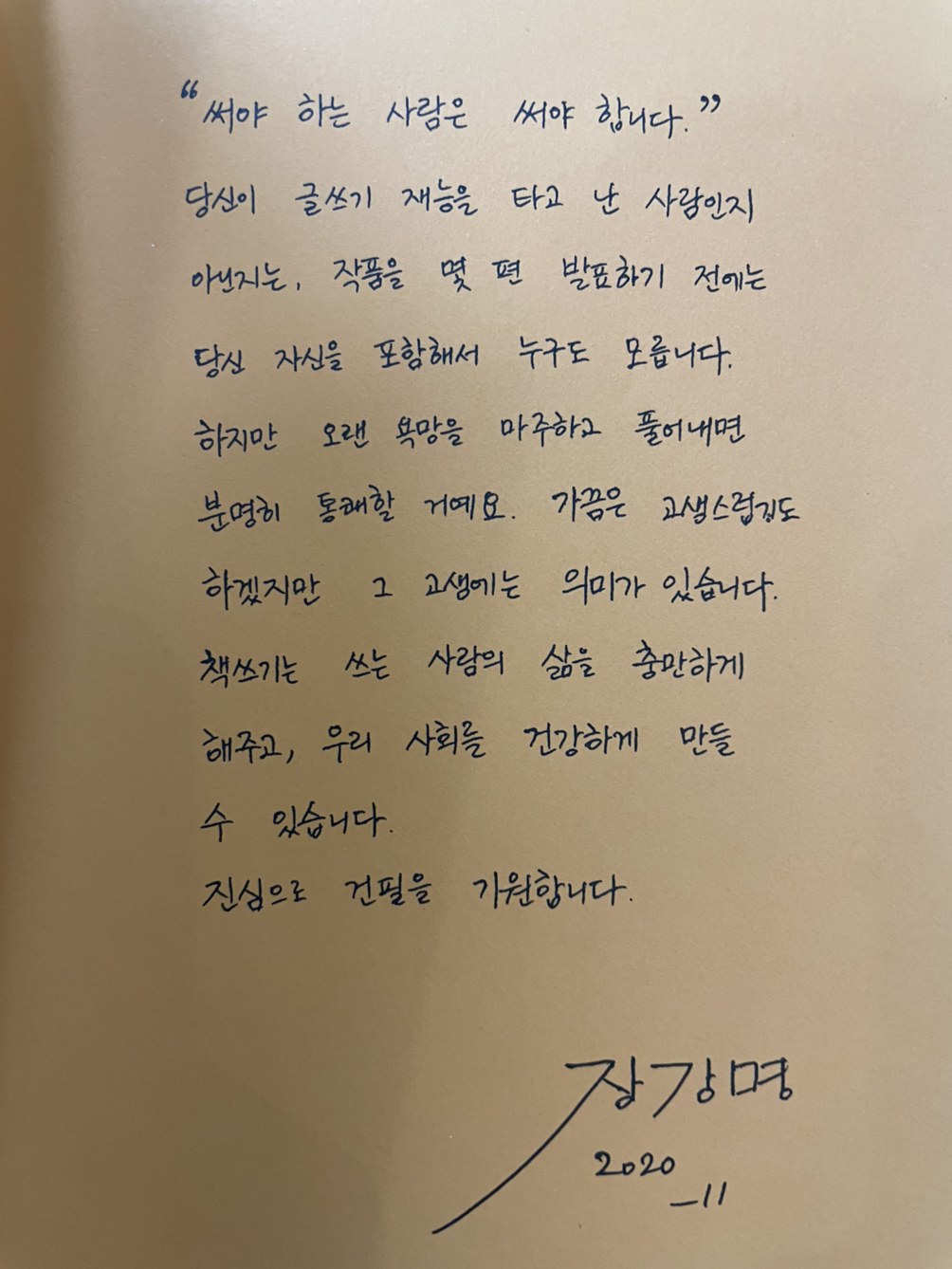 게다가 기약 없이 좌절이 이어지는 일상은 사람의 마음에도 강한 영향을 미친다. 건강한 태도를 유지하기 어려워지는 것이다. 경제적 토대가 없다면 더 그렇다. 반면 직장 생활을 하며 대실 있게 쌓은 사회 경험은 좋은 작가가 되는 데 장기적으로 유익하면 유익하지 해롭지 않다. 먼저 ‘부업 작가’로 어느 단계까지 이르기를 목표로 삼자.