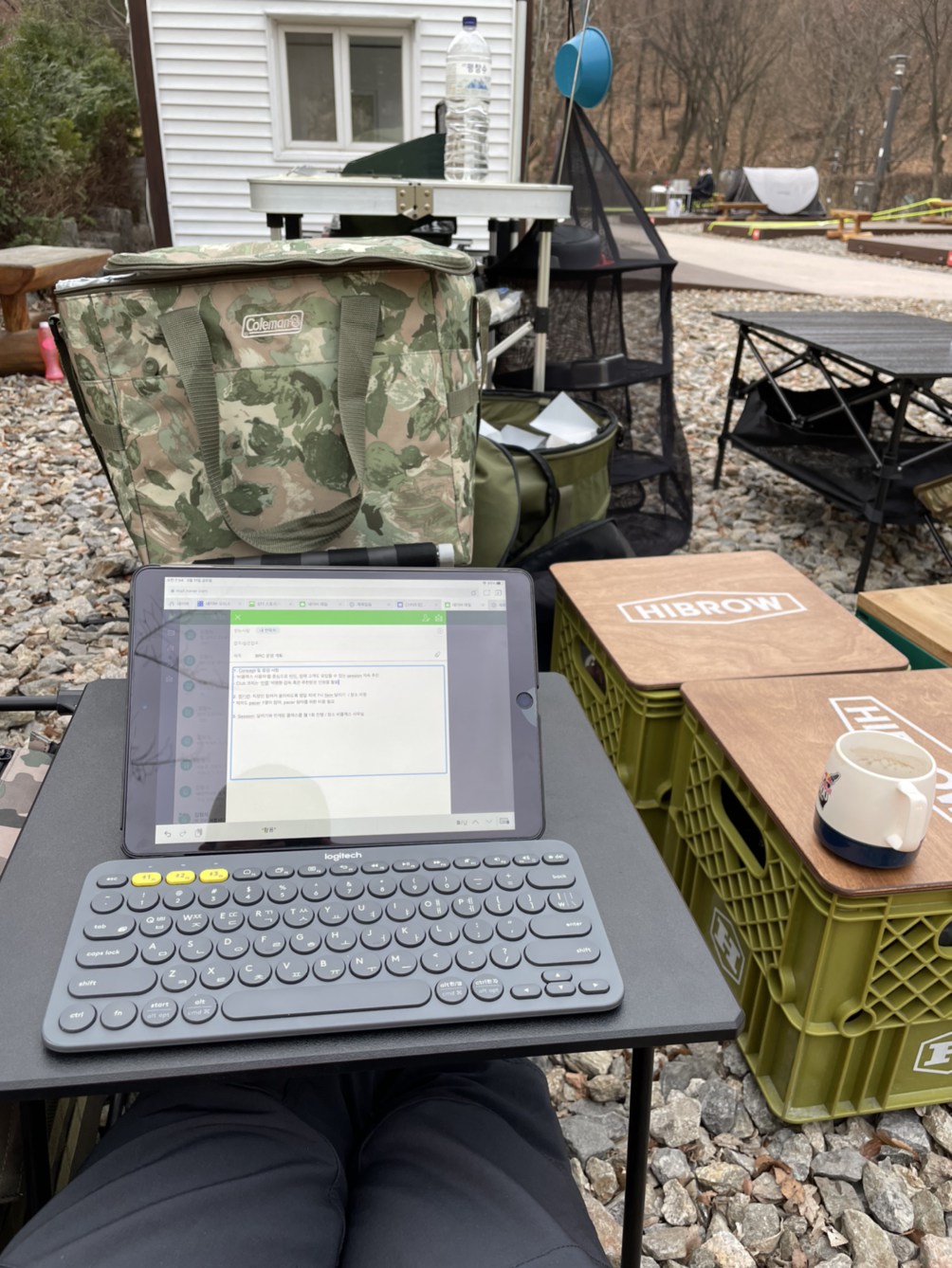 유튜브가 끝나고 정신없이 잠이 들었다. 새벽 1시쯤에 오토바이 소리 때문에 일어났다. 산책로 주변에서 오토바이가 왔다갔다 하는 소리가 계속 들렸다. 너무 화가 나서 텐트 문을 열고 나가려고 할때 캠핑장 당직 직원이 나온 것 같았다. 오토바이 소리의 주인공은 "화장실이 어디에요?"라는 어설픈 변명을 했다. 오토바이 소리가 사라졌고, 다시 잠이 들었다. 오전 6시 30분쯤 '쉬잇' 하는 신발 청소용 에어건 소리에 잠에서 깼다. 산책로 바로 옆 우리 텐트 주위에는 노인분들이 벌써 산책을 하고 계셨다. 어제 마무리 하지 못했던 일이 생각나서, 아이패드와 블루투스 키보드를 꺼내서 헬리녹스 택티컬 오피스(거창한 이름이지만 캠핑가서 쓰면 좋은 휴대용 책상)에 올렸다. 물을 끓여서 G7 블랙커피 믹스를 스텐인레스 캠핑컵에 타서 마셨다. 식어버렸던 미역국과 굳어버린 양념 돼지고기와 달리 커피가 아직 따뜻했다. 캠핑와서 처음 맛보는 내 자유시간이었다.