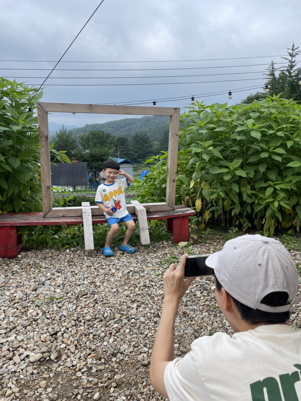 버리기는 아쉬워서 집 옷장에 처박혀 있는 것보다 추억 박물관의 턴테이블 옆이 더 잘 어울리는 자리였다. 집으로 떠나기 전에 형님이 만들어놓은 나무 프레임 앞에 아들을 세우고 사진을 찍었다. 나무 프레임 뒤로 산봉우리들이 산수화처럼 보여서 참 멋졌다.