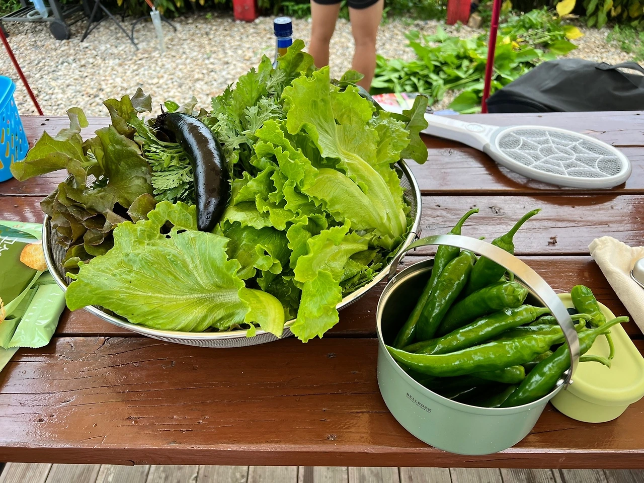 서울이 아닌 수도권만 하더라도 30평이 넘는 집이라고 하면, 집값이 억대라서 말을 꺼내기만 해도 참 부담스럽다. 형님이 직접 가꾸신 밭의 크기는 집 크기를 이야기하는 단위인 '평'을 기준으로 본다면 정말 어마어마했다. 일반적인 쌈야채인 상추 등 외에도 바질까지 재배하고 계셨다. 정말 큰 채반에 담기 시작한 쌈야채가 금세 가득 쌓였고, 바로 위에 있는 고추는 씻지 않고 바로 먹었는데도 참 시원하고 맛이 있었다.