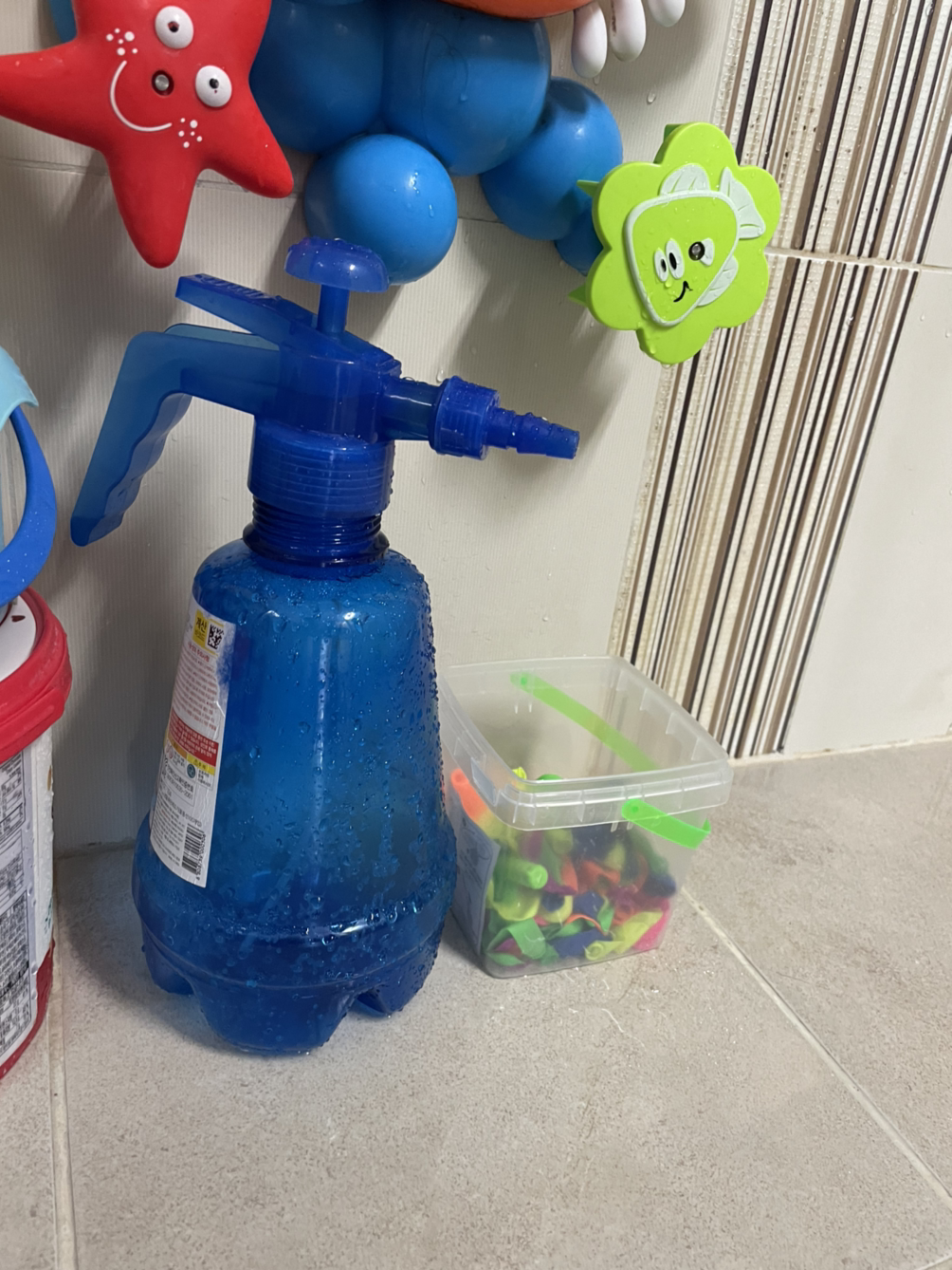 아들은 샤워를 할 때 가지고 노는 장난감이 다양하다. 하지만 요즘에는 대부분 물풍선을 가지고 논다. 다이소에서 산 물풍선에 물을 넣는 펌프와 물풍선 5개면 샤워시간이 아주 즐겁다. 물풍선에 물을 넣는 펌프는 원예용 물뿌리개와 비슷하게 생겼다. 물통에 물을 담고 펌프질을 한 뒤에 버튼을 누르면 물이 나온다. 물풍선에 물을 넣으려면 어느 정도는 세게 물을 나와야 하는데, 다이소표 펌프는 딱이다.