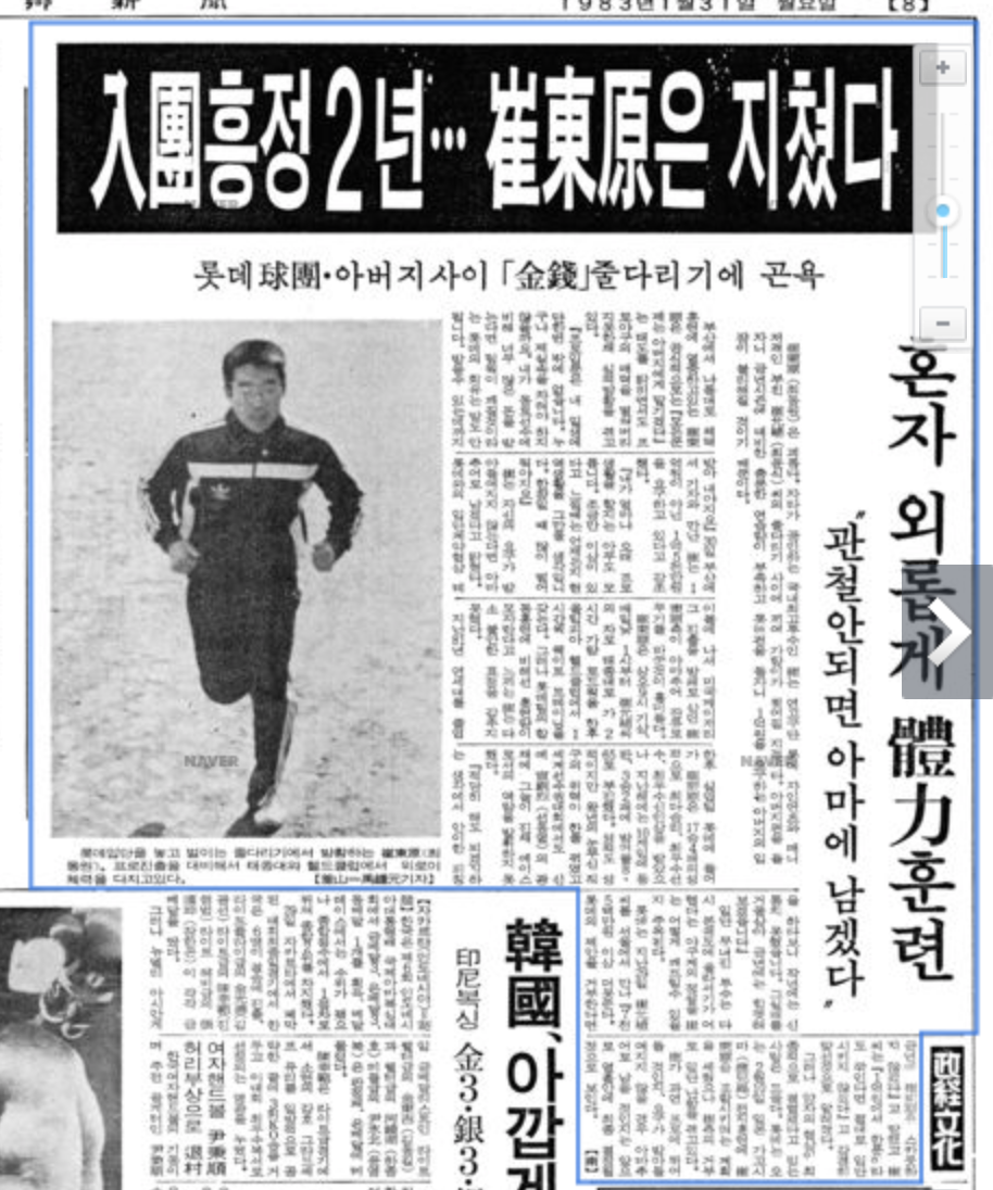 83년 입단 직전까지 계약금을 한 푼이라도 깎으려는 롯데 구단과 줄다리기를 하느라 시즌 준비가 늦어졌고 그동안 혹사당하느라 허리 부상이 생겨 전반기 내내 공을 던지지 못했다. 하지만 83년 시즌 종료 후 하루에 1,000개가 넘는 공을 던지며 몸 관리에 들어갔고 84년 최동원은 화려하게 부활한다.