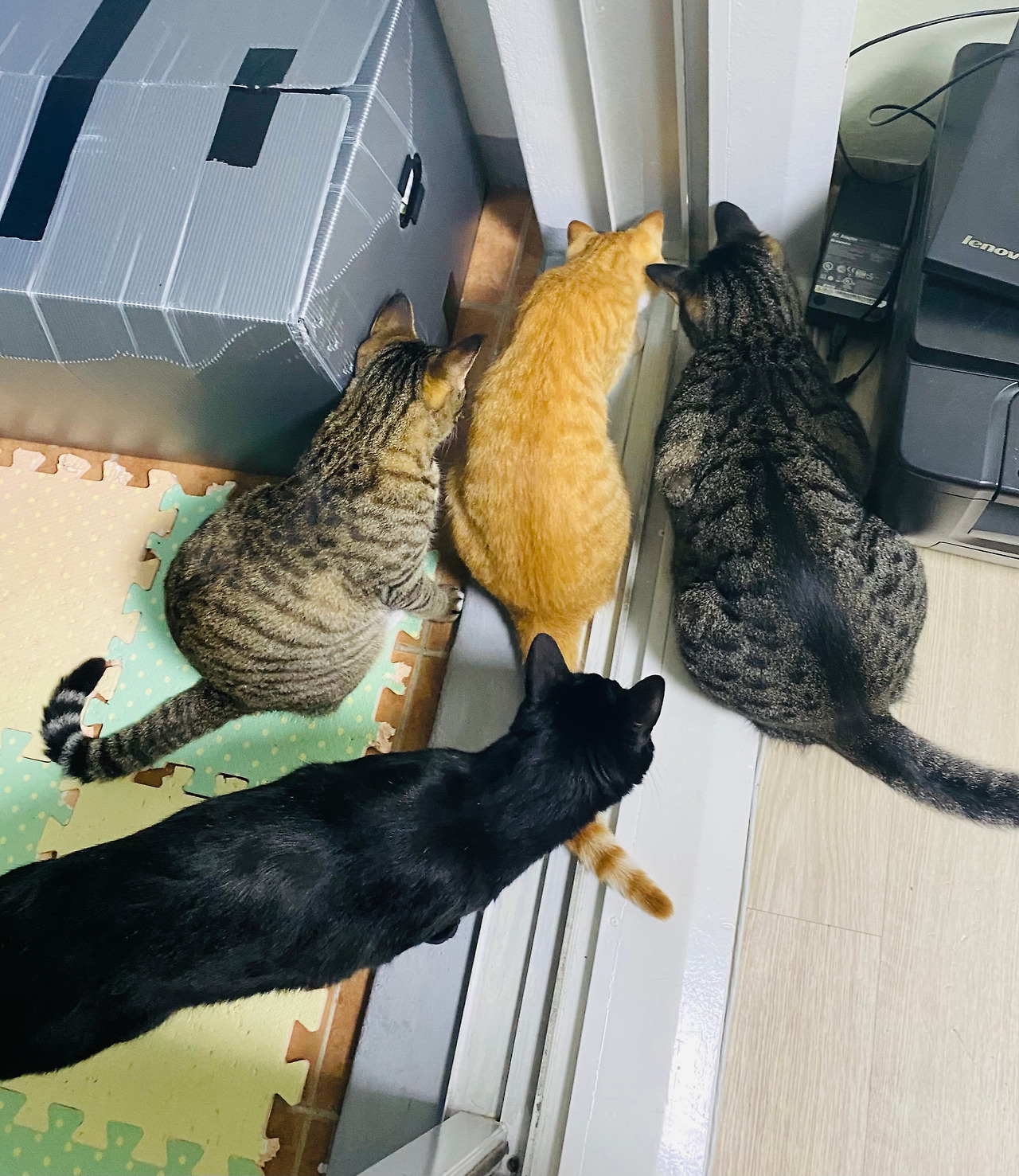 우리 집에는 네 명의 사람과 네 마리의 고양이가 함께 산다. 더 신기한 건 성별 비율도 똑같다는 것. 우리 집은 남자 셋, 여자 하나로 이루어져 있다. 남편과 쌍둥이 아이들, 그리고 나. 고양이들도 마찬가지다.
