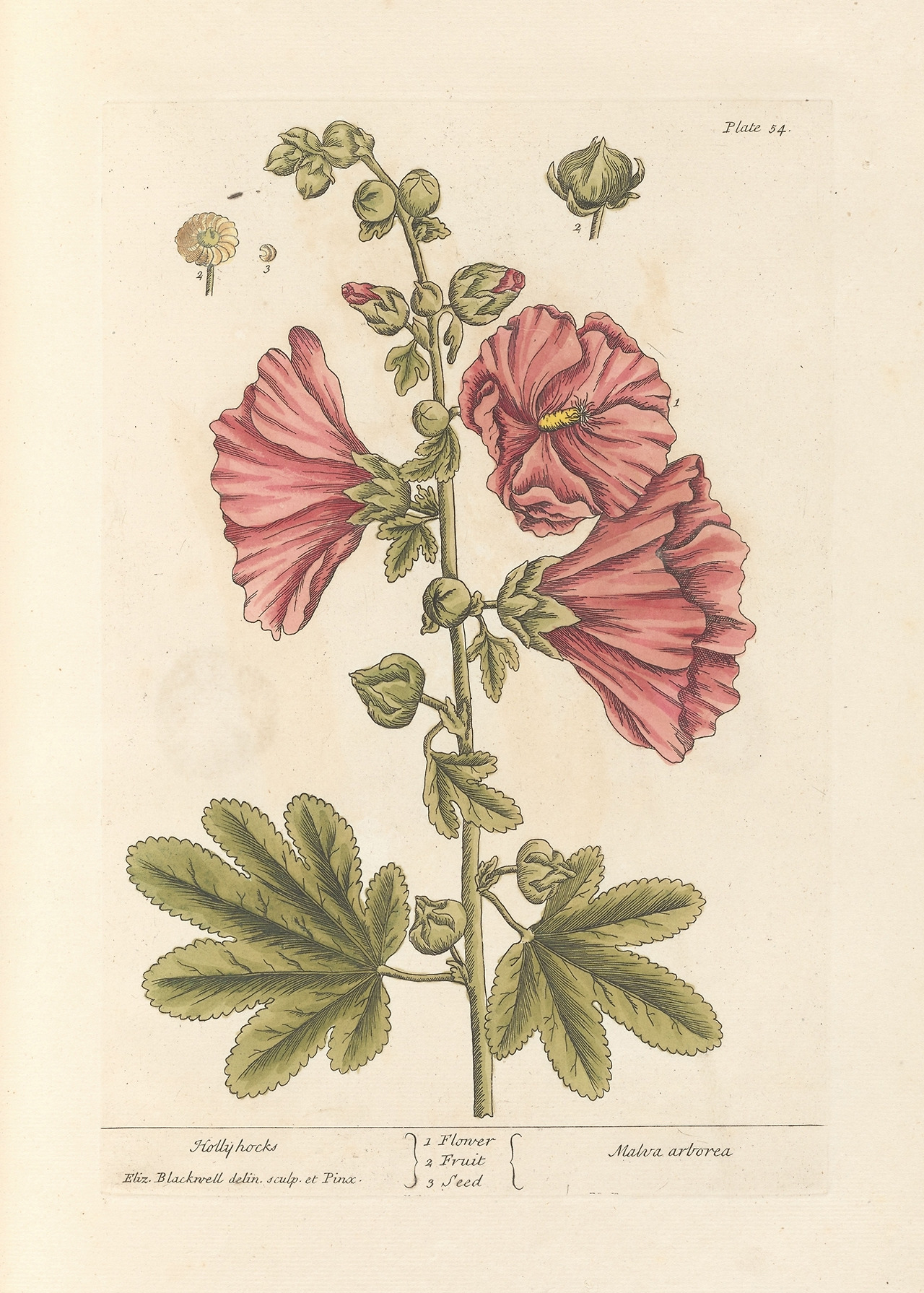 Hollyhocks (1739), Elizabeth Blackwell, artvee
