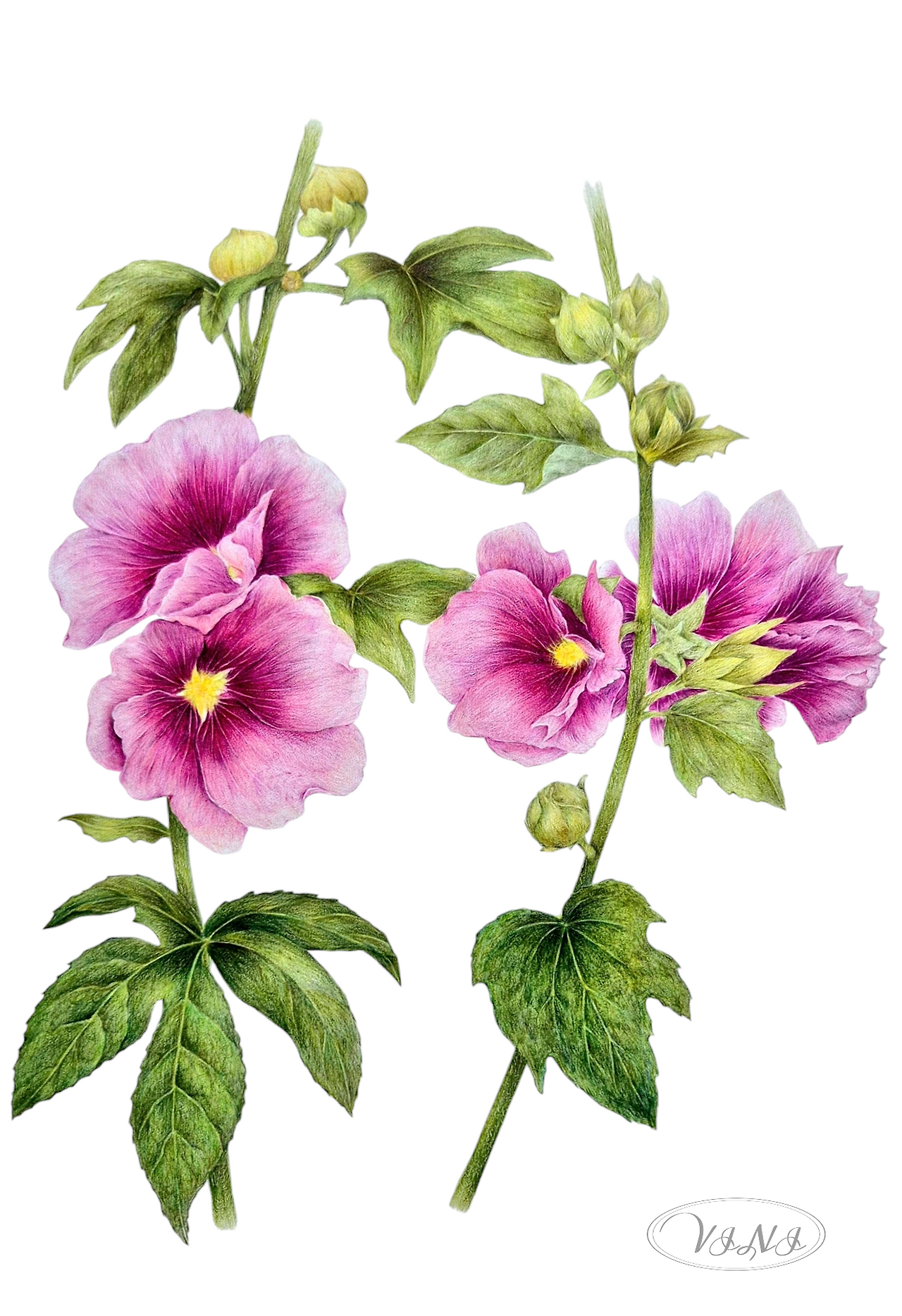 접시꽃이 새삼스럽게 예쁘다고 느낀 날도 어린 둘째와 함께 병원에서 나오는 길이었다. 오르락내리락하는 열 때문에 밤새도록 짜증 내는 아이 옆에서 한숨도 못 자고 병원으로 오픈런 한 날. 병원 뒷문으로 나오는데 그동안 눈여겨보지 못한 접시꽃이 활짝 피어나 있었다. 화단을 제대로 차지하고 있는 것도 아니고 커다란 몇 개의 화분에서 소소하게 화려함을 뽐내며 자라고 있는 모습을 보니 아마도 상가 관리인이 정성스럽게 가꾸신 듯 보였다. 큰 키에 누가 더 예쁜지 자랑이나 하듯 줄지어 얼굴을 드러낸 모습이 아름다워서 어젯밤의 시름도 눈곱만 떼고 겨우 나온 내 몰골도 잊어버리고 접시꽃 감상에 취하고 말았다. 그 후로도 따스한 봄에서 뜨거운 여름으로 넘어갈 때마다 많은 접시꽃을 봤지만 끝날 것 같지 않았던 고된 육아로 힘들었던 날 위로하던 병원 뒷길의 접시꽃처럼 강렬하지는 않더라. 핸드폰 카메라에 담아두었던 그때의 접시꽃을 시간이 조금 지나서 그렸던 것 같다.