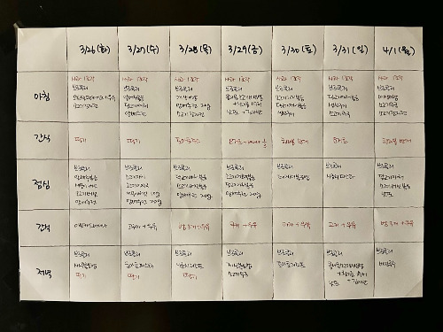 출장을 준비하는 아내의 모습은 경이로웠다. 전 날 밤을 꼬박 새우면서 일주일치 짐을 싸는 모습보다 놀라운 건, 아이를 위한 식단표였다. 혹여 한 번이라도 부실하게 먹을까 봐 세끼에 더해 간식까지 촘촘하게 준비했다. 냉장고에 붙어 있는 표를 보고 입을 다물 수가 없었다. 회사에서 인수인계를 할 때도 이렇게 할까. 이모님과 내가 적절히 요리할 수 있도록, 얼린 재료를 넣고 날짜를 적은 지퍼락까지. 자신보다 더 아들을 생각하는 모습에 엄마의 위대함을 느꼈다. 궁금해졌다. 사랑이 넘치면 이타심이 되는 걸까. 그렇다면 나는 힘들 때 가족을 덜 사랑하는 걸까.