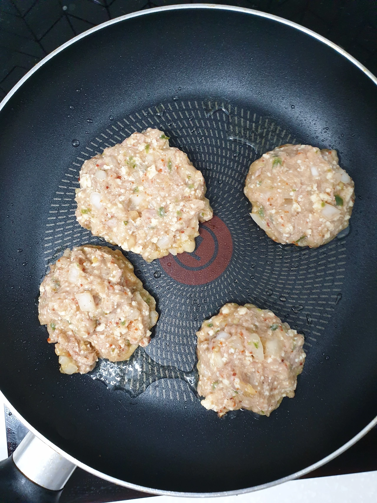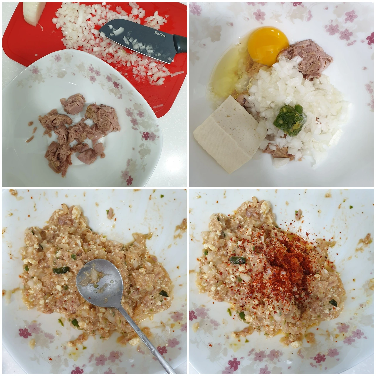 참치는 체에 걸러서 기름을 빼서 준비하고 다진양파, 으깬 두부도 참치양만큼 준비해 골고루 섞어준다. 계란 하나에 전분은 계란 노른자 두개 양 정도 넣고 잘 섞는다. 반죽이 묽은데 싶은게 맞다. 너무 묽다고 전분 콸콸 넣으면 망(亡). 솔직히 망했다. 그래서 이 기록은 나의 오답노트다.