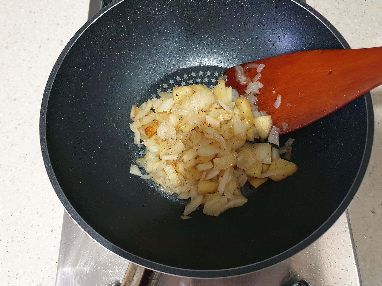 감자 한개와 양파 반개(계란 2개 사용 기준)를 잘게 썰어서 팬에 기름을 두르고 볶는다.