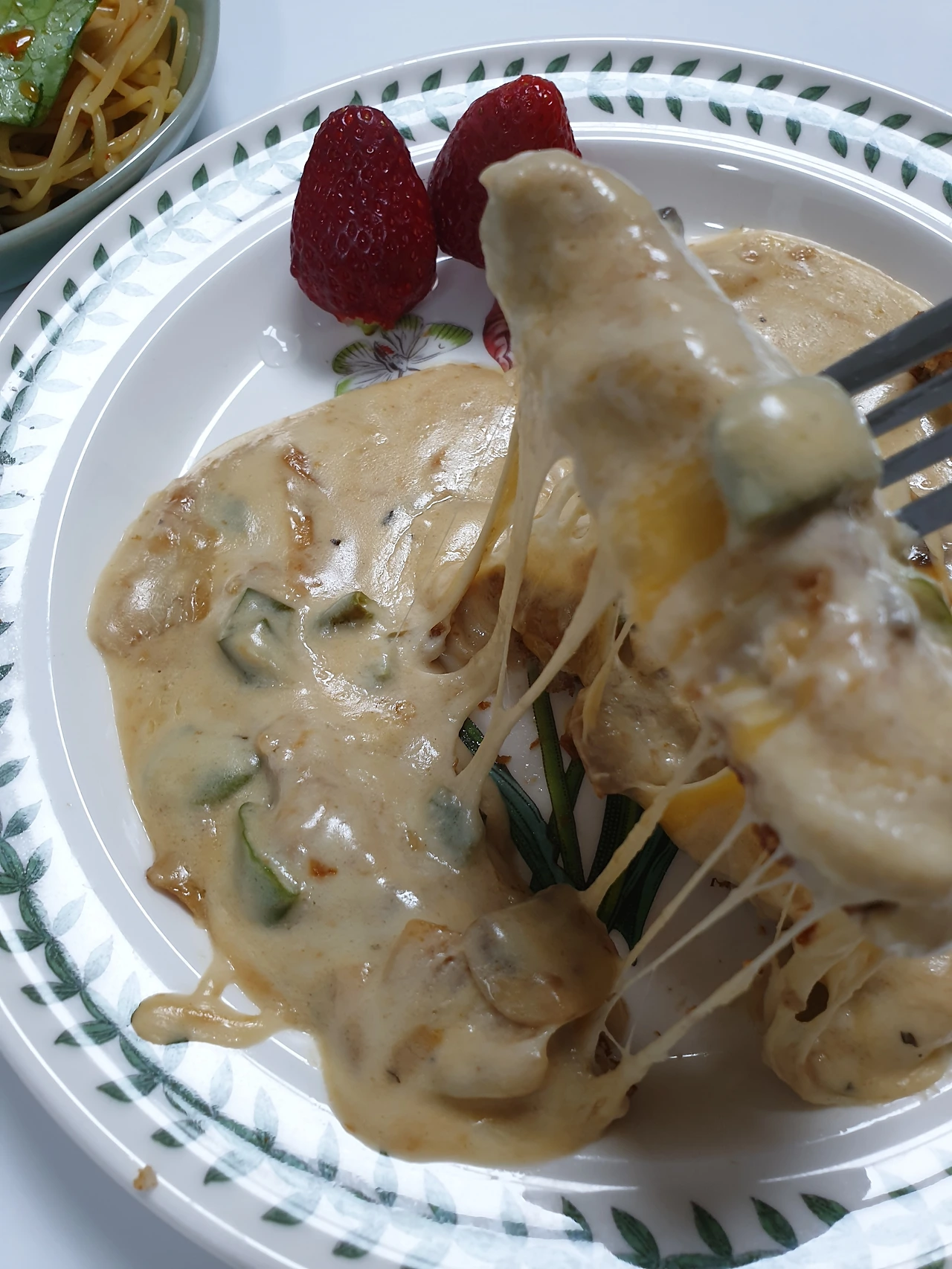 접시 한쪽엔 샐러드 파스타를 곁들일 생각이었는데 크림소스와 치즈가 용암처럼 흘러내리는 바람에 공간이 애매해졌다. 그래서 애매한 자리는 딸기 두 개로 데코를 하고, 샐러드 파스타는 다른 그릇에 담아낸다. 청양고추 덕분에 크림소스 돈가스가 그다지 느끼하게 느껴지지는 않지만 식탁에 상큼함을 더하고 영양소 균형도 맞추기 위해 샐러드 파스타를 같이 준비했다.