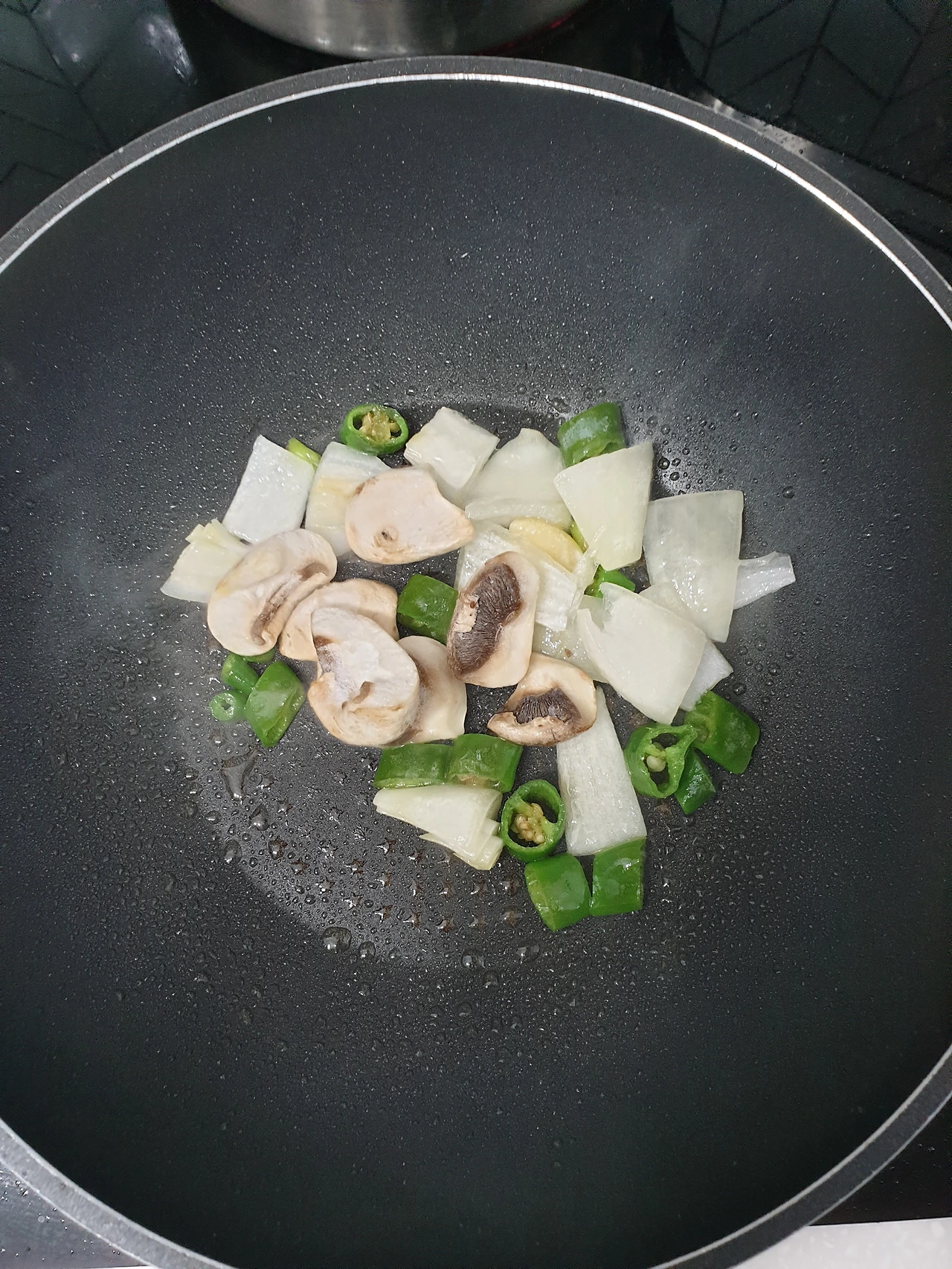 돈가스와 크림소스는 시판 제품을 사용했다. 그러고 보니 내가 만든 요리라 부르기엔 뭔가 민망해진다. 정확히는 내가 조합한 밀키트 정도가 되겠다. 야채는 냉동실에 남아 있던 자투리 야채를 사용했다. 언젠가 사놓은 양송이와 언젠가 배달음식에 딸려왔던 청양고추, 양파, 마늘.