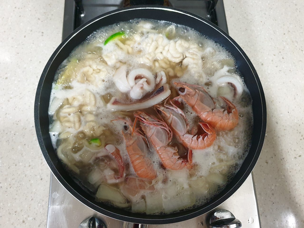 못 사먹은 칼국수는 직접 끓여보자. 시원한 해물칼국수로. 해물을 다듬는 게 보통일이 아니므로 대형마트의 해물탕 키트를 이용하기로 했다. 구성품과 원산지 확인은 필수! 해물탕 육수와 딱새우, 오징어, 곤이만 쓰고 나머지는 해물된장국이나 해물라면에 쓰기위해 소분해서 다시 냉동실로. 육수에 다진 마늘, 감자, 양파, 곤이만 넣고 끓여준다. 칼국수면은 다른 냄비에 따로 끓여내어 찬물에 한번 씻어줬다. 면을 육수에 같이 넣고 끓이면 국물이 걸쭉해지고 해물의 시원한 맛이 줄어들기 때문이다. 딱 먹기좋은 면발보다 10프로 남겨두고 삶긴 면은 찬물에 담갔다가 국물과 다시 끓여준다. 이때 딱새우, 오징어, 호박을 같이 넣어 한소끔 끓여준다. 비린내 잡는 청주 한 스푼으로 마무리!