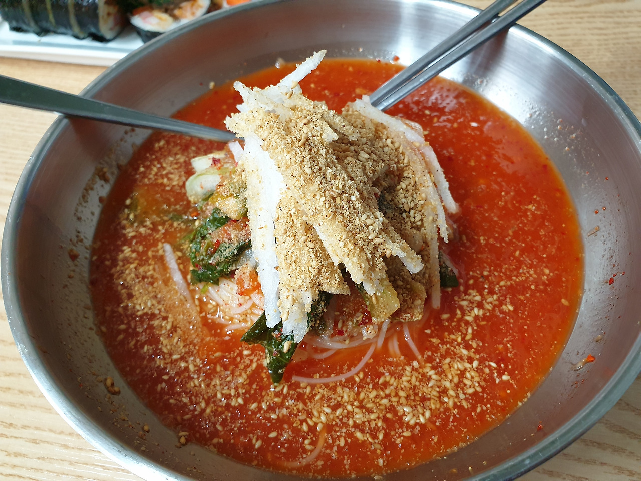 가끔 메뉴에 없는 칼국수와 떡국도 번외로 파실 때가 있다는데 풍문으로만 들었지 실제로 먹어 본 적은 없다. 하긴 공식메뉴인 김밥과 열무국수도 늦으면 못 먹을 수 있다. 봄날이 계속되다 어느 하루 기온이 뚝 떨어지던 날, 그렇게 맛있다고 소문난 칼국수를 한 번 먹어보고 싶어서 사장님 기분을 살폈다. 눈치보며 조심스럽게 열무국수 하나, 칼국수 하나 시켜도 되나요 물었더니, "뭐라카노 똑띠 크게 말해라." 다시 한번 또박또박 열.무.국.수. 하나, 칼.국.수. 하나 이렇게 시켜도 되나요하며, 되나요는 자신없게 끝을 흐렸다. "칼국수 읎다. 안한다." 그럼 열무국수 두개요 하고 얼른 앉았다. "칼국수 안한다. 여기 아재들이 을매나 좋아하는데, 근데 안하기로 했다. 이제 안해." 네네 하며 살얼음 가득한 열무국수를 그릇째 들고 들이켰다. 국물 남기면 사장님한테 혼난다. 여기 사장님은 불친절하기로 유명하시다. 오죽하면 구글맵 정보에도 사장님이 불친절하다는 리뷰가 남겨져 있다. 말을 툭툭 던지시니 타지 사람들은 놀랐을지 모른다.