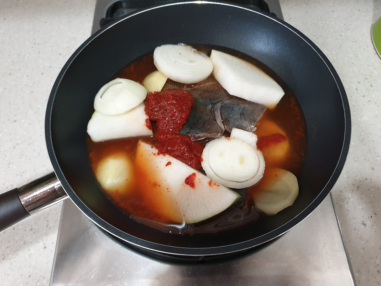 무, 감자, 양파, 생선, 양념장 넣고 물 부어 한꺼번에 끓였더니 실패! 감자와 무는 잘 안 익고 생선살은 물러졌다. 두껍게 썬 무와 감자를 양념장 넣고 물을 부어 먼저 끓이다가, 물이 끓으면 그때 생선을 넣어 푹 졸여준다. 양념장은 간마늘 반 스푼, 고추장 한 스푼, 고춧가루 한 스푼, 청하(소주는 끝맛이 쓰다는 경험담이 종종 있어 청하를 선호하는 편이다.) 한 스푼