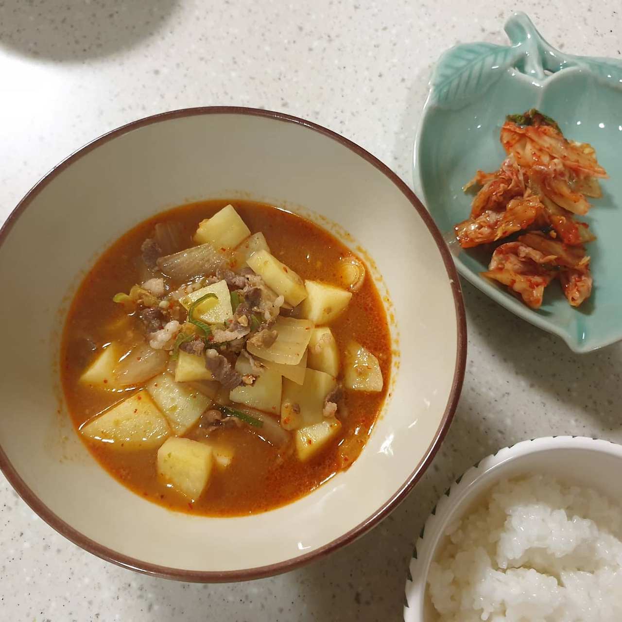 재료 : 된장, 국간장, 차돌박이, 감자, 양파, 파, 청량고추, 고춧가루 포인트 : 1. 된장으로만 간을 맞추지 않는다.된장 1 대 국간장 1/2 정도로 간을 맞춰야 국물이 뻑뻑하지 않다. 2. 간마늘을 넣지 않는다. 신맛이 날수 있기 때문이다. 3. 차돌박이를 잘게 썰어 충분히 볶아준다. 기름이 녹아야 국물이 맛있다. 4. 감자가 익을때까지 끓여주면 된다. 포인트만 주의하면 조리법은 간단하다. 차돌박이를 볶아서 기름이 충분히 나오면 물을 붓고 감자, 양파, 된장, 국간장, 고춧가루, 청량고추를 넣고 푹 끓이다가 감자가 익으면 송송 썰은 파를 넣어주면 완성. 무나 호박을 넣어주면 더 그럴듯하지만 안넣어도 충분하다.