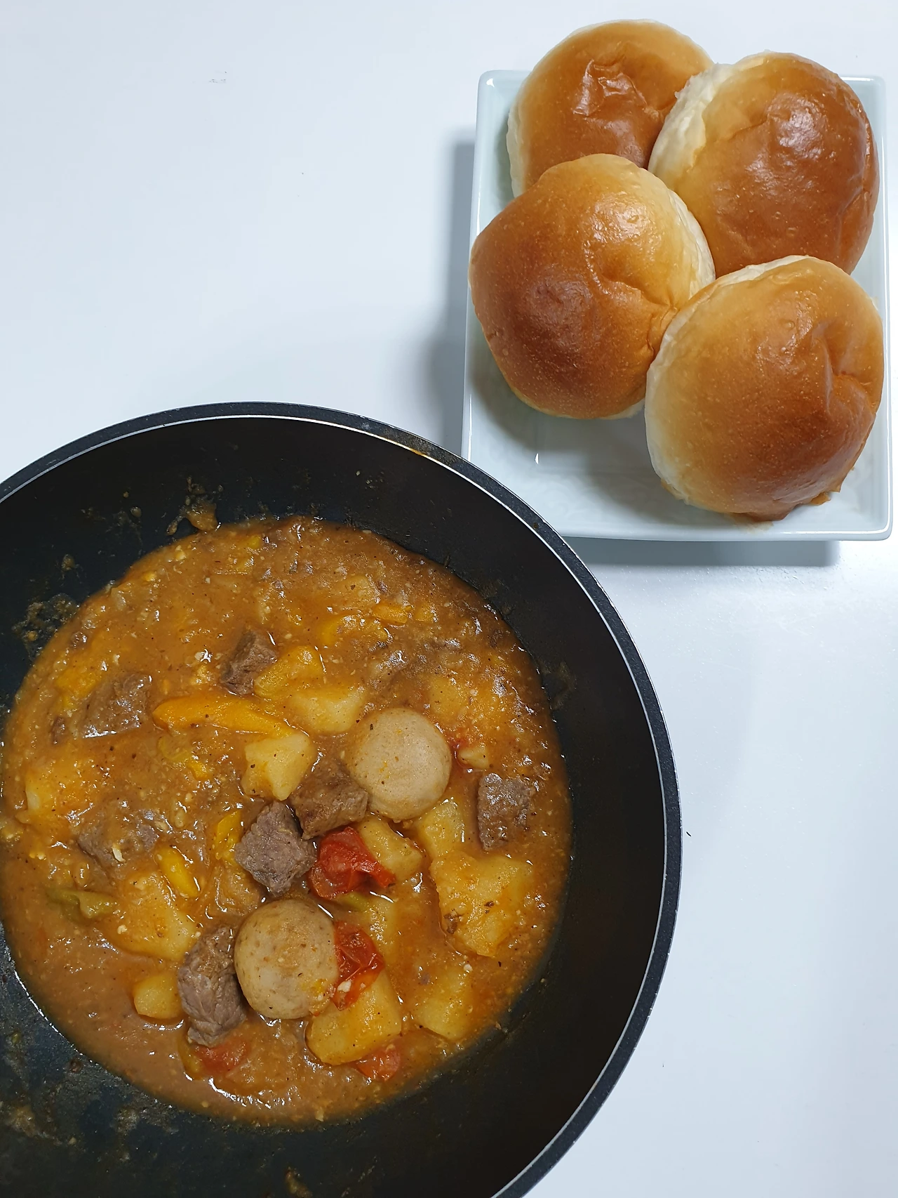 고기는 밑간을 하여 팬에 한 번 볶은 후 찜을 하였으면 더 좋았을 것 같다. 토마토를 많이 넣었더니 신 맛이 난다. 원래 전통 굴라쉬에는 화이트 와인과 레드 와인이 생각보다 많이 들어가므로 신맛이 나는 것이 전통 맛에 가깝지만 똠얌꿍과 같은 신맛에는 호불호가 있는 한국인들이니 산도는 입맛에 맞게 조절이 필요할 듯 하다. 전통 굴라쉬는 파프리카 가루가 들어가서 색이 더 곱지만 파프리카 가루 대신 파프리카를 생으로 넣었더니 조금더 묽어졌다.