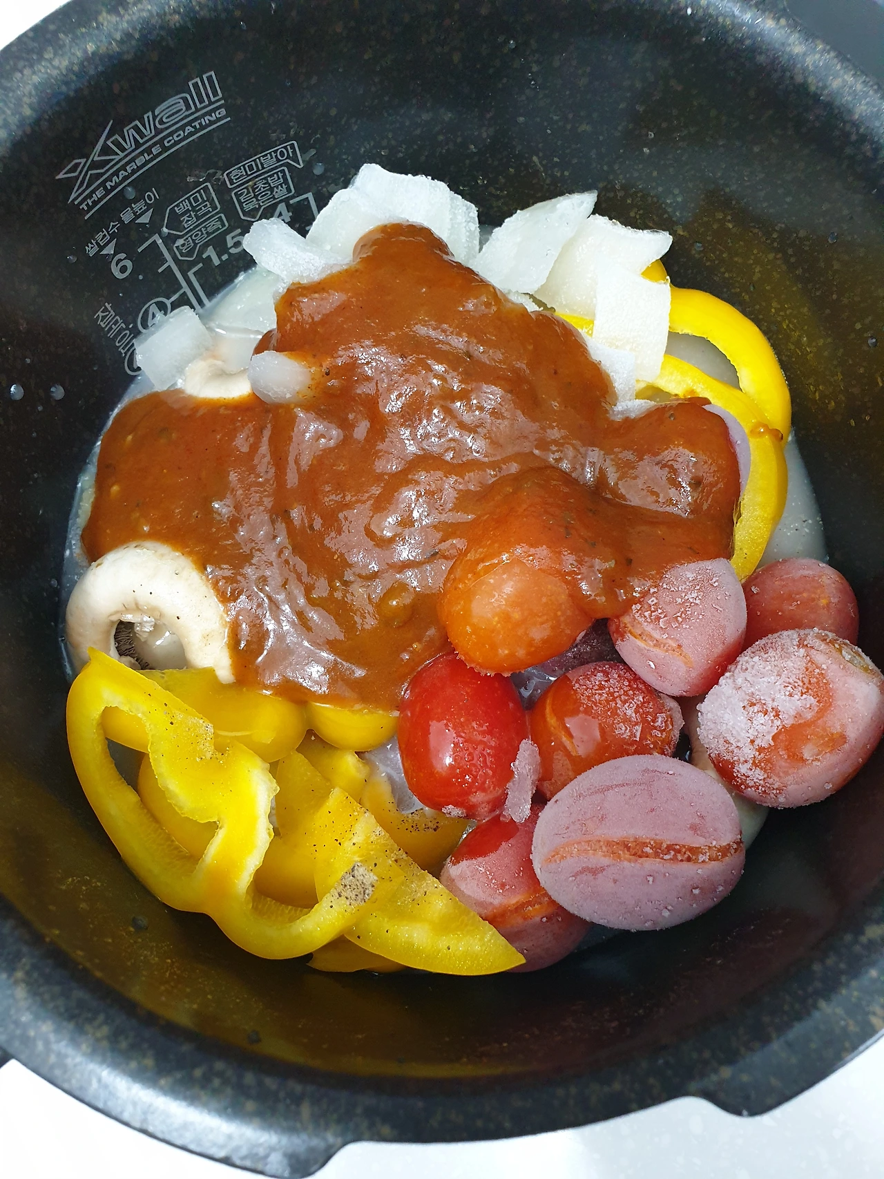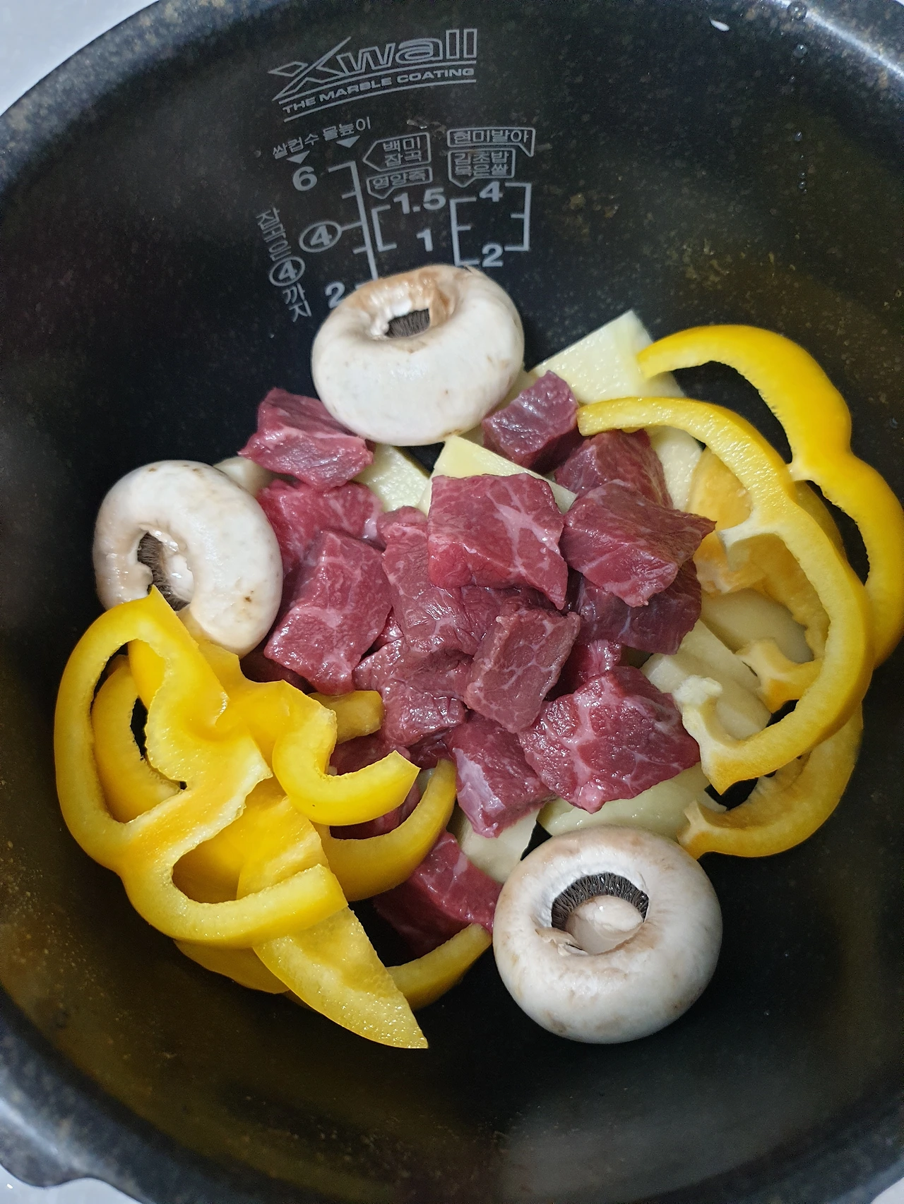 한우 설도를 한 입 크기로 자른 후, 감자와 양송이, 파프리카, 양파, 토마토 등 각 종 야채와 함께 전기밥솥에 넣고 시판 사골육수 350ml를 부워준다. 다진 마늘과 후추, 소금 약간을 더한 후 토마토 소스(파스타 소스) 남은 것(430ml짜리 병의 2/3에서 1/2 정도 남았던 것 같다.)을 넣어준다. 마지막으로 청양고추 한 개 또는 두 개. 그리고 만능찜 설정으로 45분을 맞춰주면 끝. 야채 때문에 물이 많이 나오면 냄비로 옮긴 후 조금만 졸여 주거나 전분가루 한 스푼 정도 넣어주면 빵과 같이 먹기에 딱 좋다.