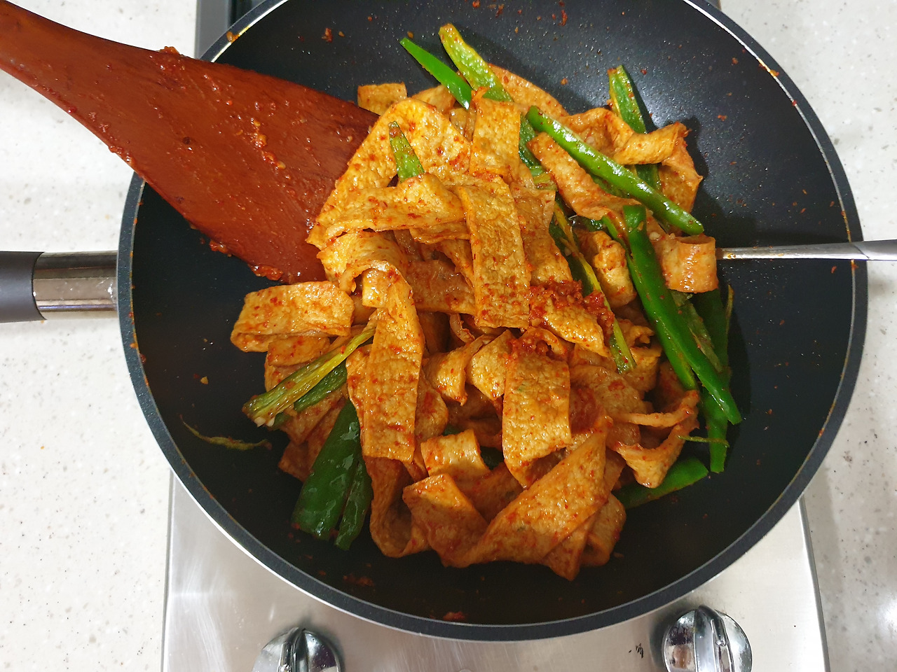 어묵을 양념에 잘 버무려 약불에서 볶는다. 거의 다 볶였을 때 세로로 길게 잘라 씨를 제거한 청량고추 같이 볶아낸다.