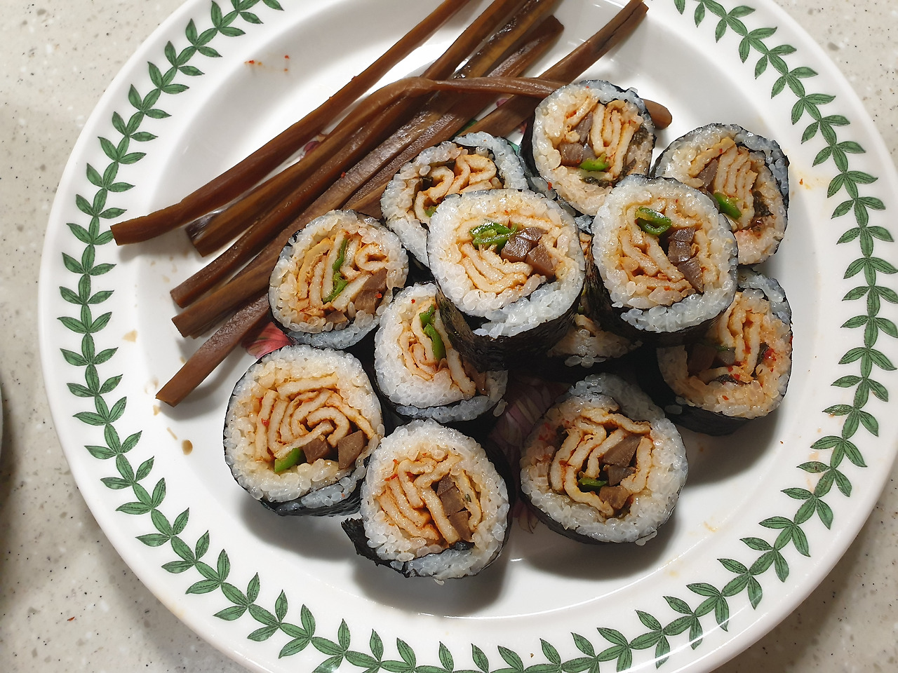 이제 김발에 김 놓고, 밥 놓고, 어묵 폭탄, 청량고추는 한 줄, 조미우엉은 두 줄 놓고 싸준다.