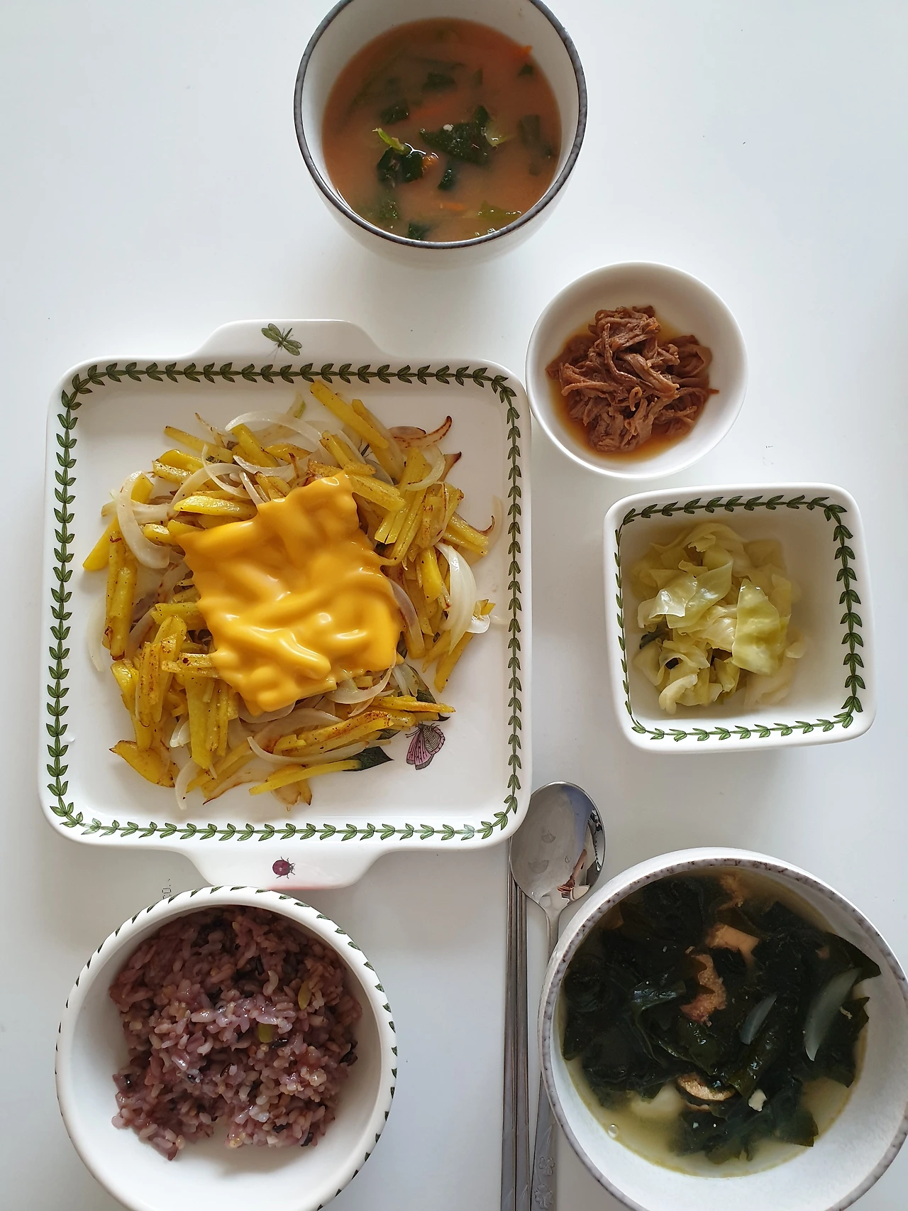 마지막으로 장조림은 대기업표, 물김치는 엄마표. 감자볶음에 유통기한 다 되어가는 체다치즈를 올리고 밥은 15곡이 섞였다는 잡곡에 찹쌀을 더해서.