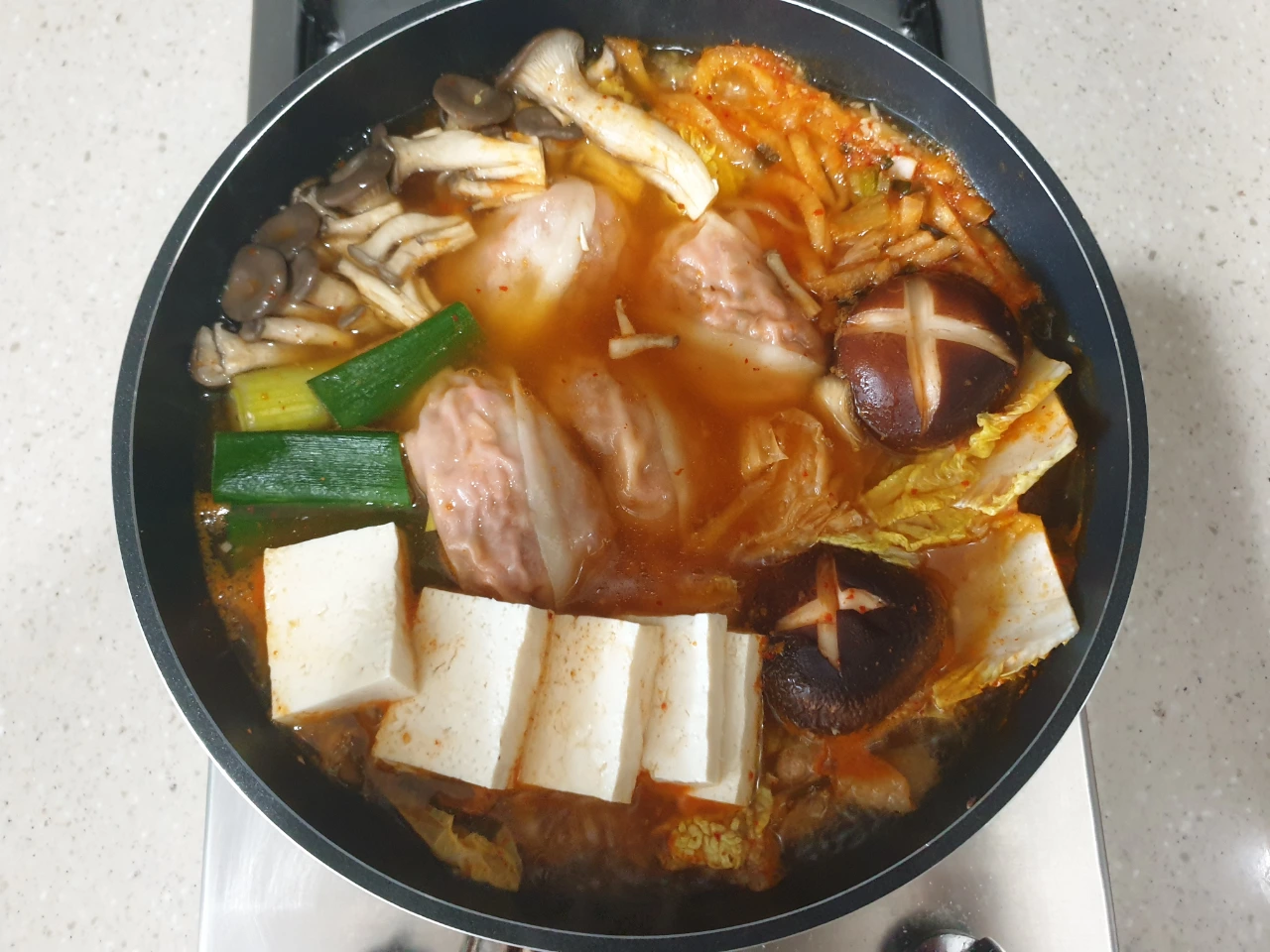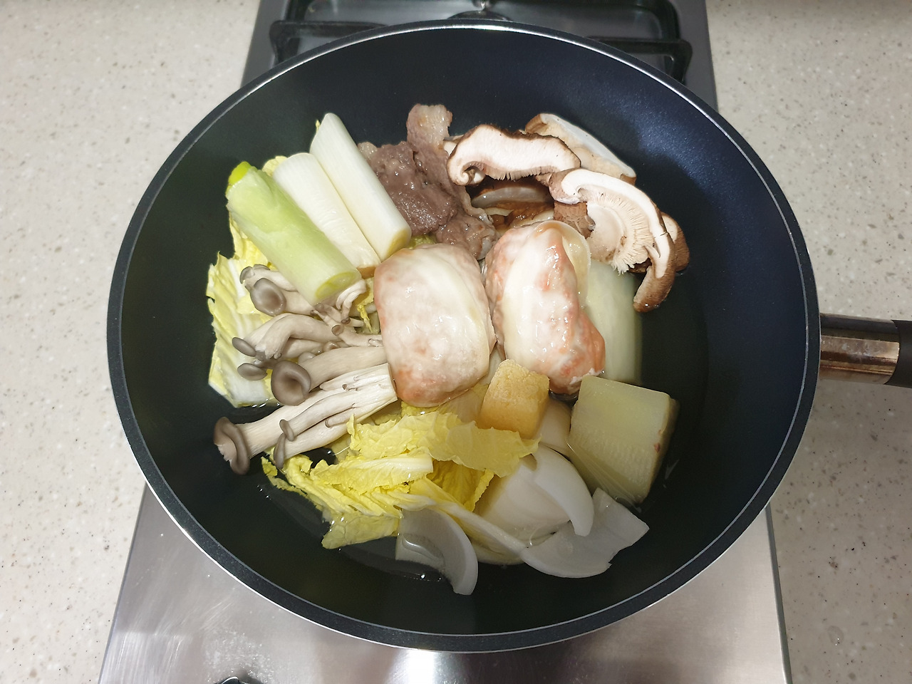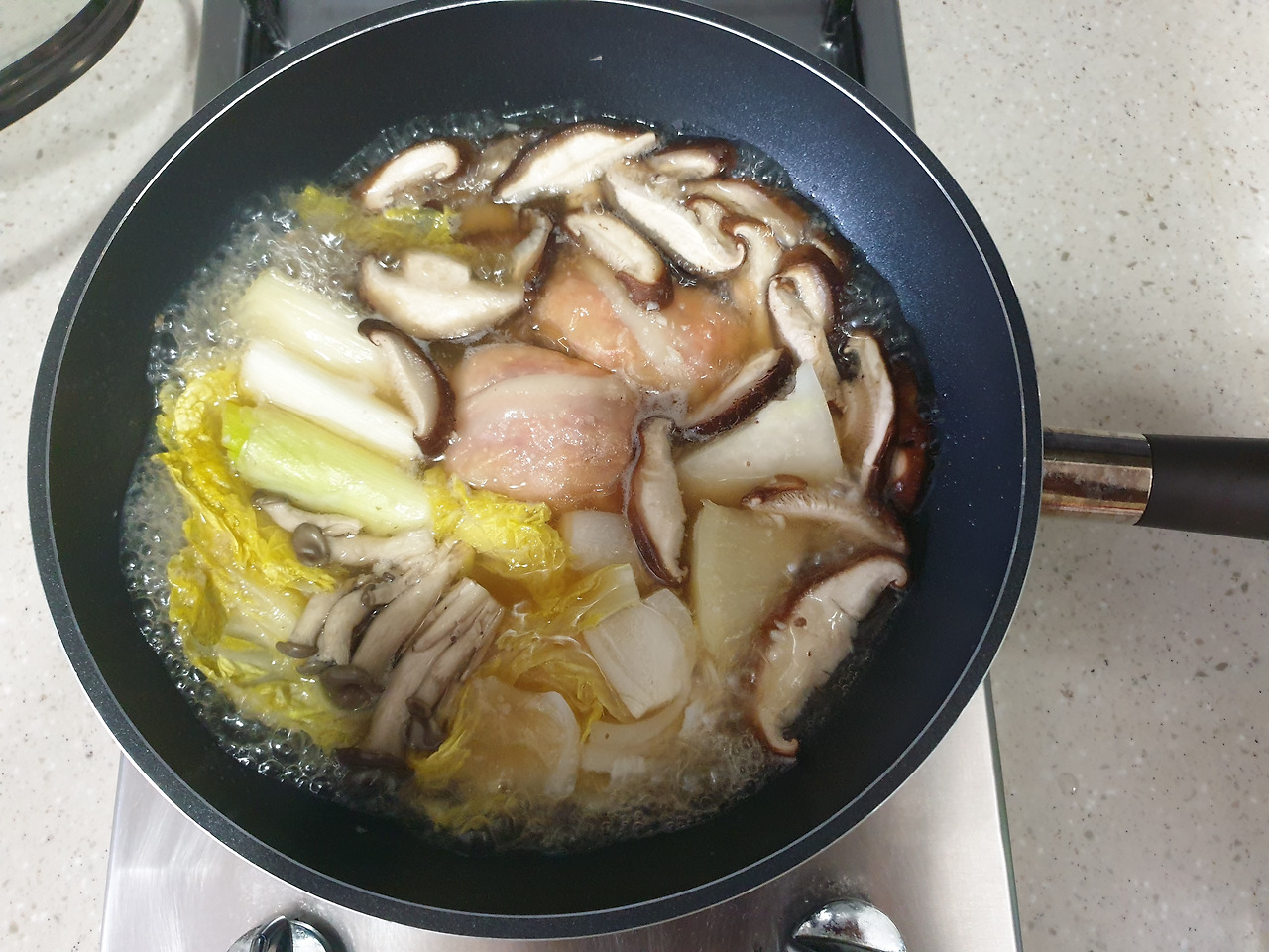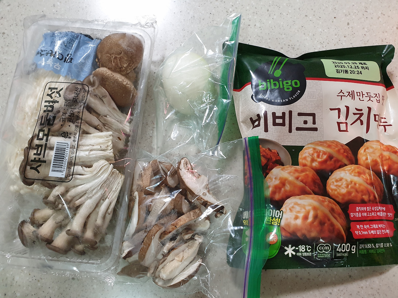 마른 멸치로 육수만 만들어 놓으면 딱히 많은 노력은 필요치 않다. 간마늘, 배추, 파, 무, 양파, 버섯, 소고기,만두에 육수 부어 끓이면 끝.