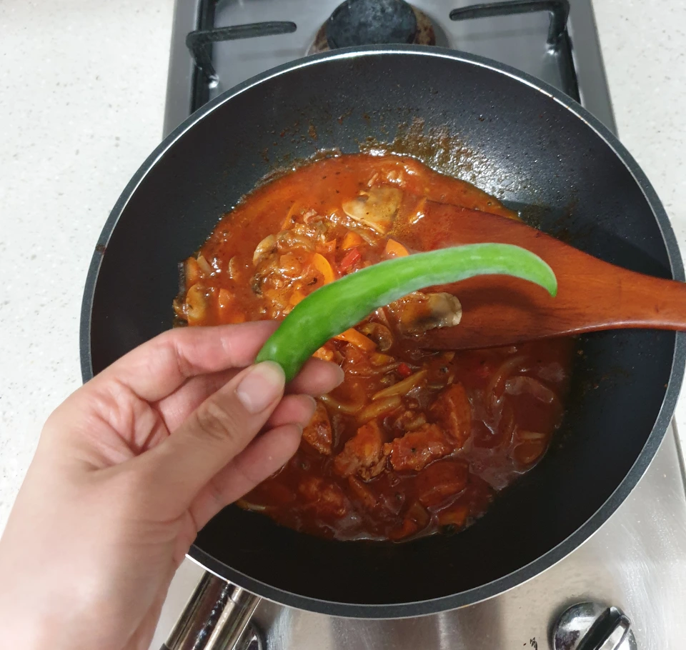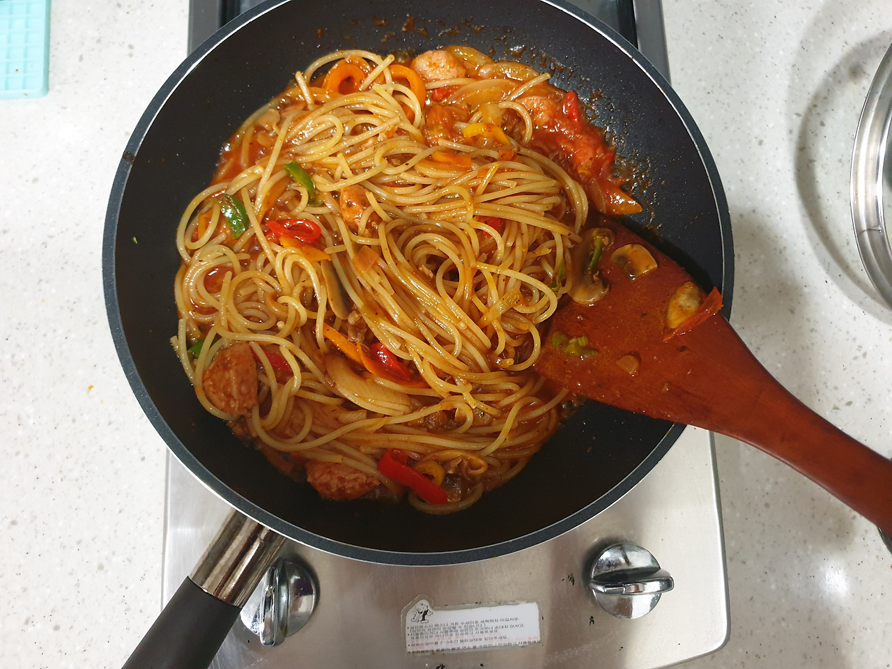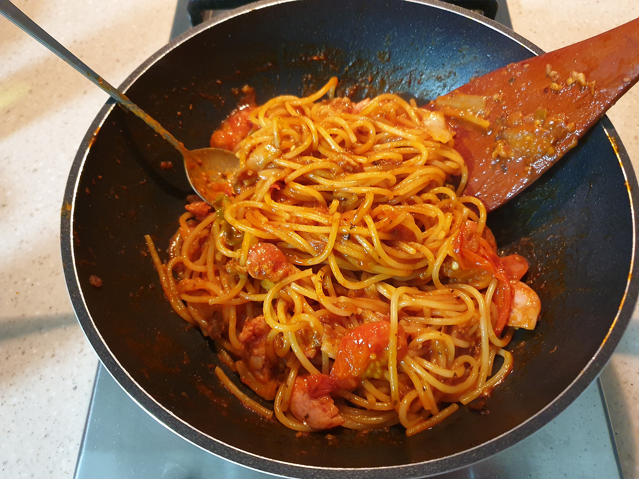 소스는 시중 토마토소스를 사용하는데, 생토마토를 조금 더 넣어준다. 방울 토마토 다섯개, 또는 큰 토마토 하나 정도. 토마토를 익혀 먹으면 건강에도 좋다고 한다. 들어갈 부재료는 기호에 따라. 나도 매번 냉장고 사정에 따라 다르다. 꼭 넣는 게 있다면 소세지와 양파, 버섯.