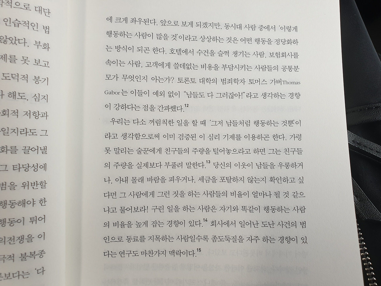 "우리는 다소 꺼림칙한 일을 할 때 그저 남들처럼 행동하는 것뿐이라고 생각함으로써 이미 검증된 이 심리 기제를 이용하곤 한다. 가령 못 말리는 술꾼에게 친구들의 주량을 털어놓으라고 하면 그는 친구들의 주량을 실제보다 부풀려 말한다. 당신의 이웃이 남들을 우롱하거나, 아내 몰래 바람을 비우거나, 세금을 포탈하지 않는지 확인하고 싶다면 그 사람에게 그런 짓을 하는 사람들의 비율이 얼마나 될 것 같으냐고 물어보라! 구린 일을 하는 사람은 자기와 똑같이 행동하는 사람의 비율을 높게 잡는 경향이 있다."