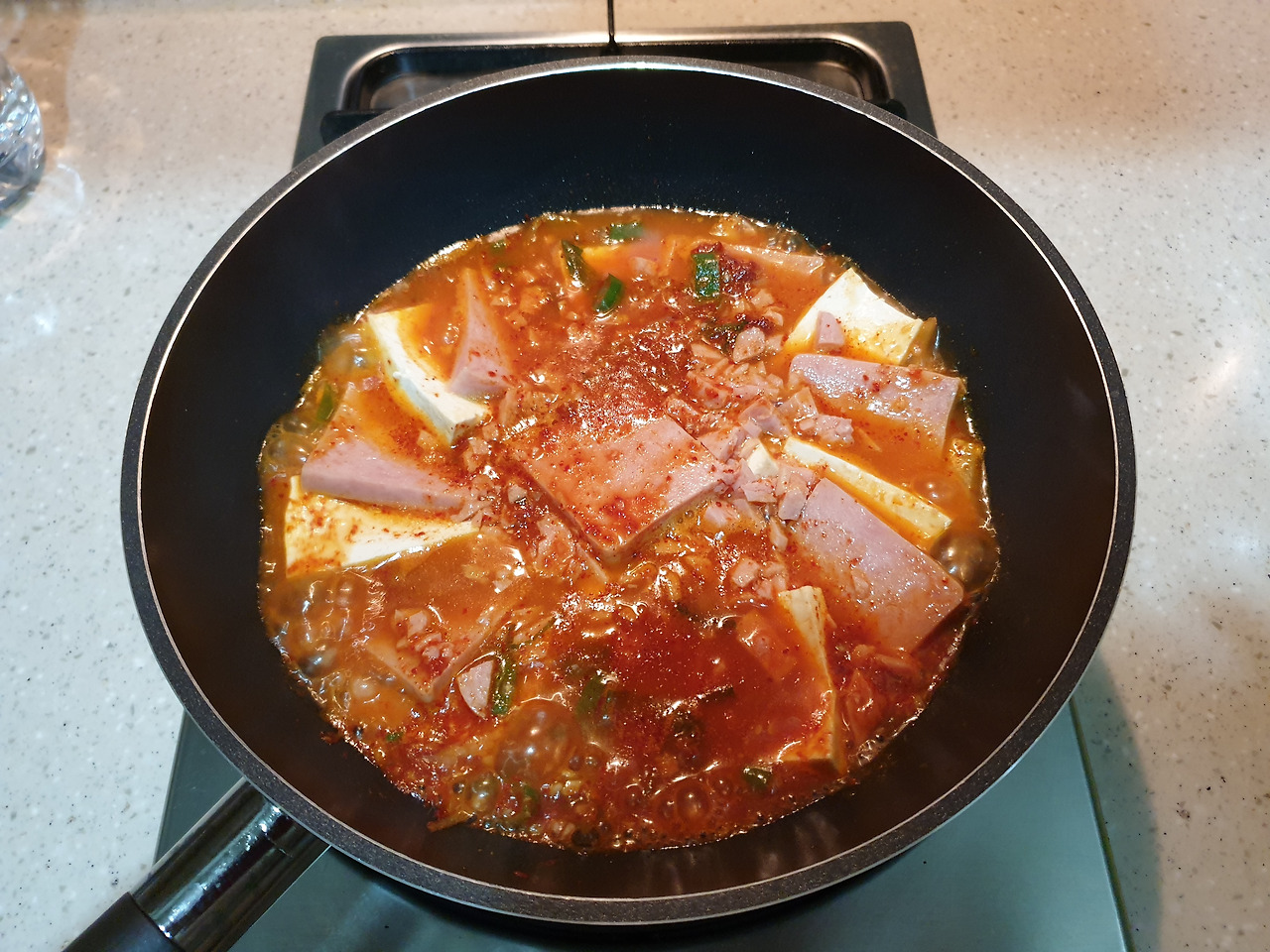 두부와 스팸 위에 양념장을 듬뿍 얹어 육수를 자작하게 부워 끓여주면 완성! 육수는 1200원짜리 시판 사골국물, 마지막에 청량고추와 파를 넣어 주면 별거 안들어가고 별거 안한거에 비해 맛있게 밥 한그릇 뚝딱할 수 있다.
