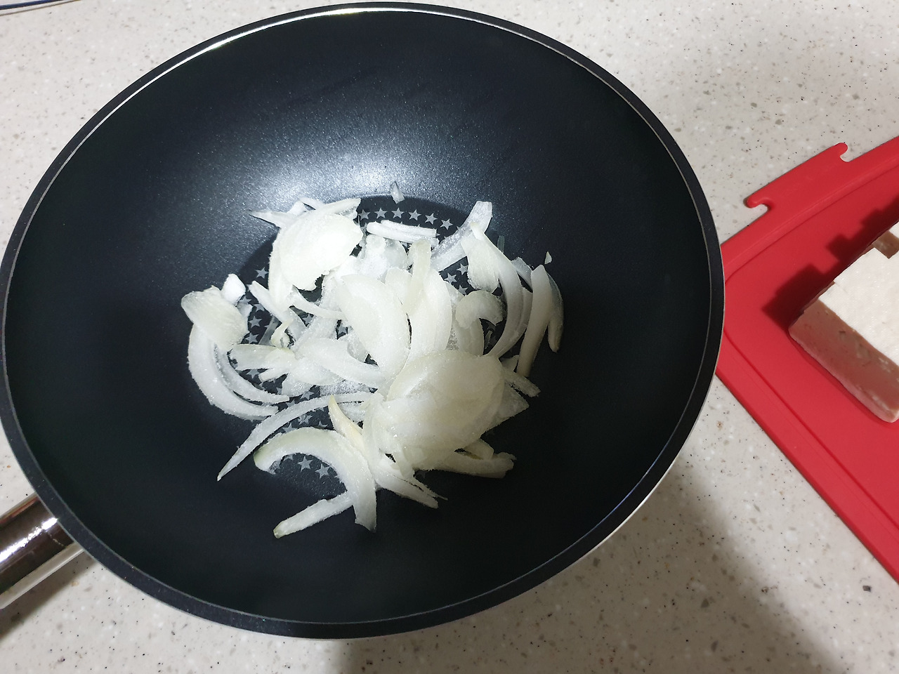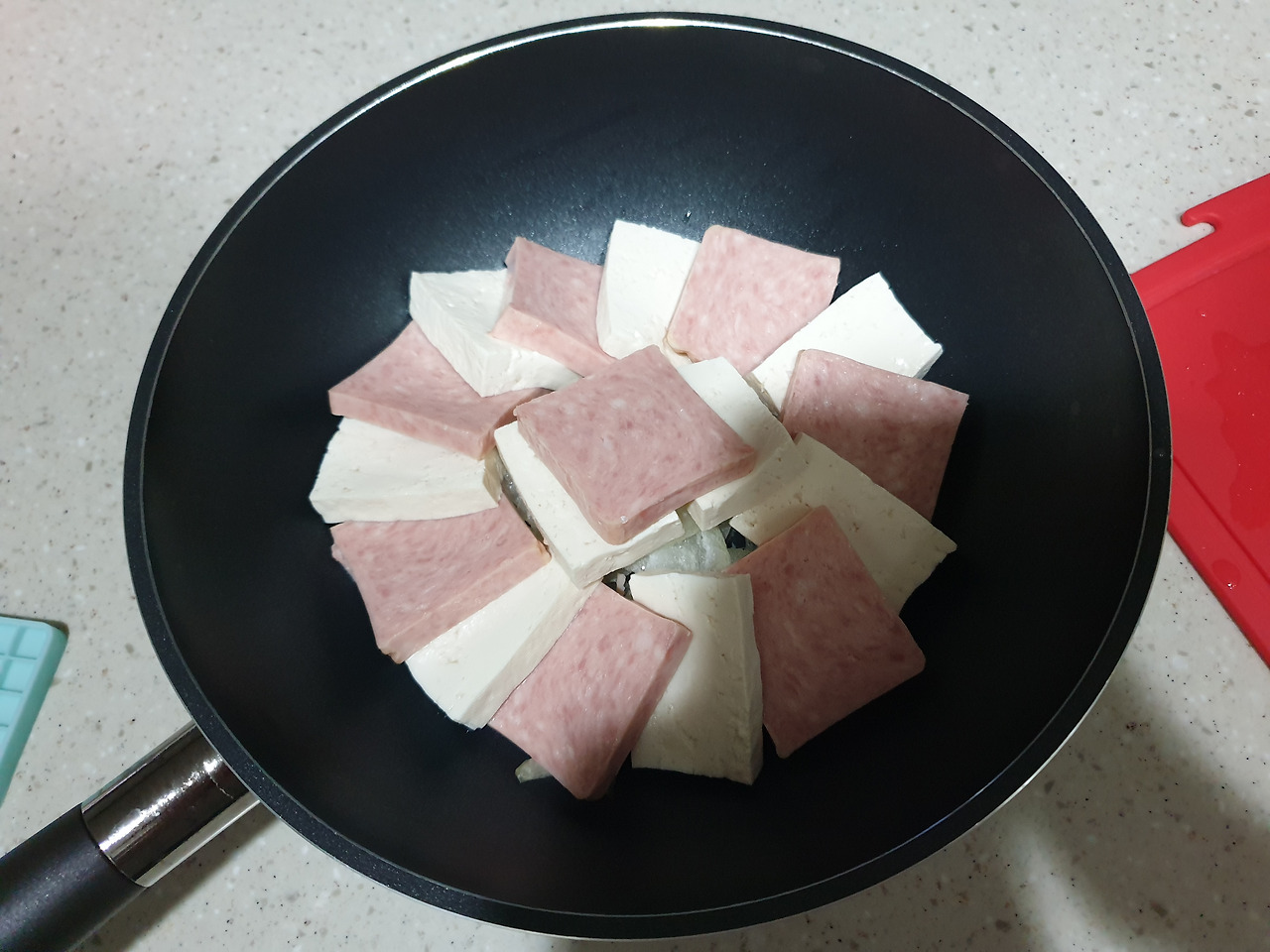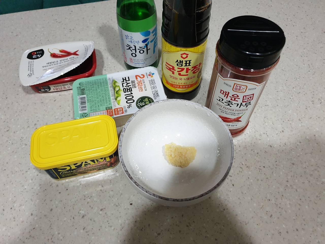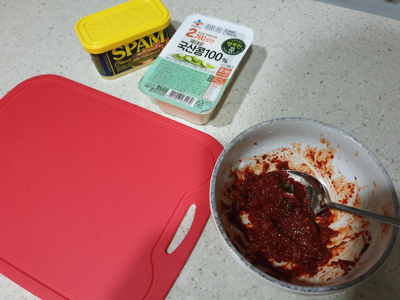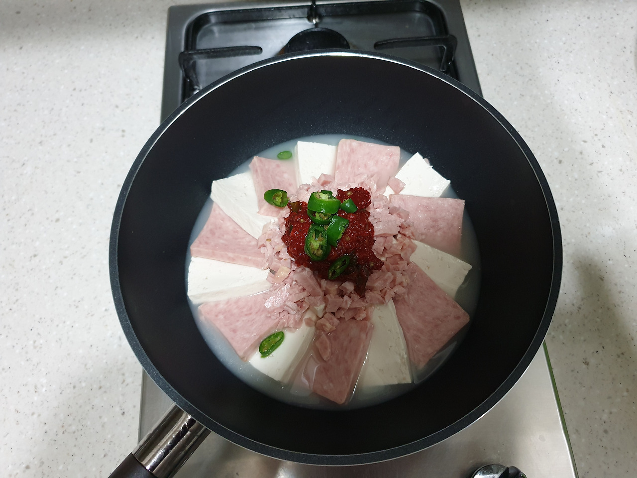 재료 : 국간장2 고춧가루2고추장1맛술1다진마늘 두부180그램 스팸200그램 송송파 양파 청량고추 양념장 만들기 나는 두부 180그램, 스팸 200그램 기준, 국간장 2 고춧가루 2 고추장 1 맛술 1 다진마늘 1 로 양념장을 만들었다. 고추장도 짜고 스팸도 짜다는 걸 생각지 못해서. 간장은 양념장 만들땐 빼고 다 끓은 후에 혹시라도 간이 안맞을때 넣어주는 것으로. 궁중팬에 채썬 양파를 깔아주고 그 위에 두부와 스팸을 올려준다.