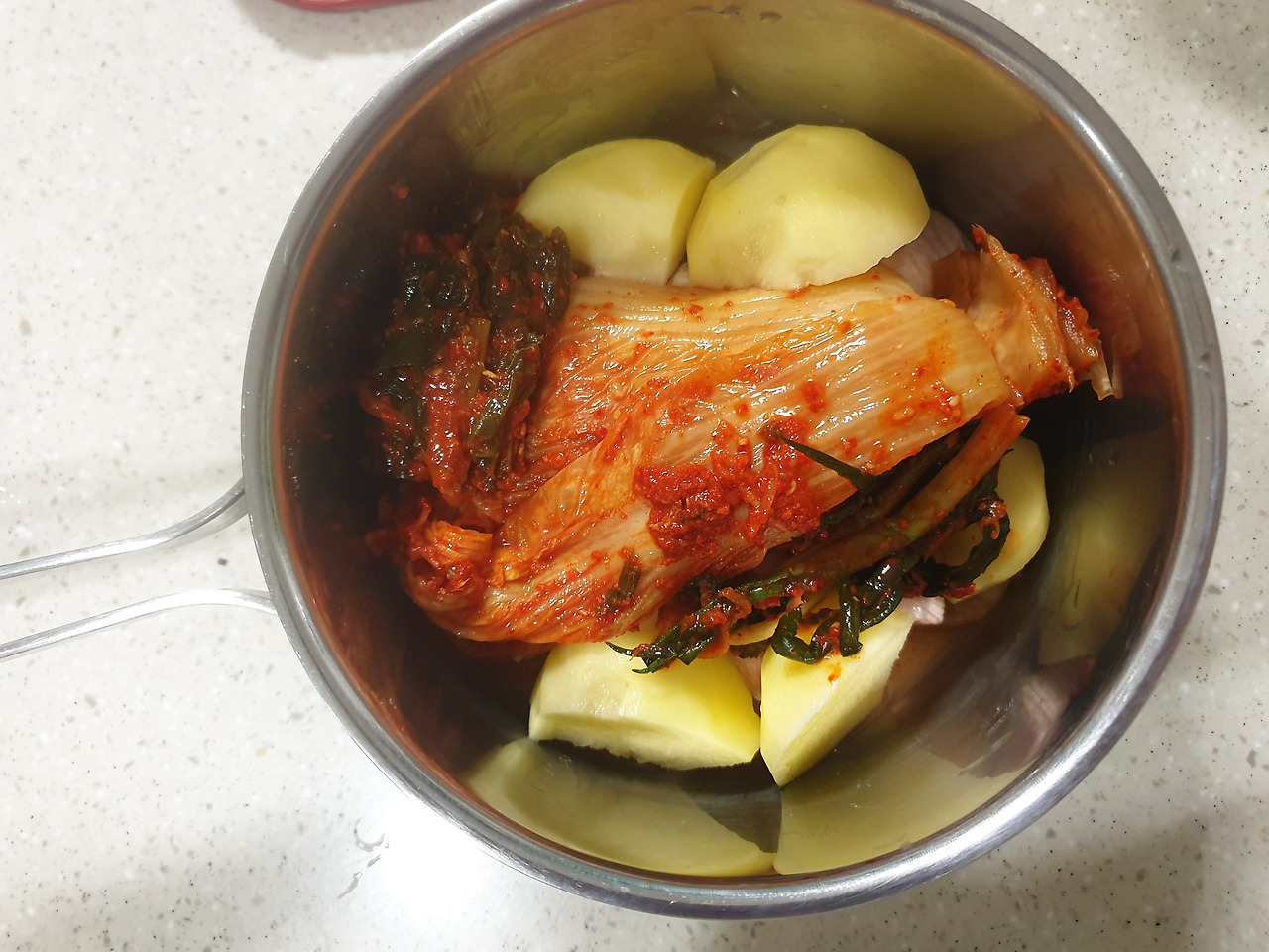 레시피는 세상 간단하다. 닭볶음용 닭 반마리에 김치 반포기의 반. 큼직하게 썬 무를 냄비 바닥에 깔고 그 위에 닭, 닭 위에 김치 덮어 물 붓고 1시간 넘게 푹 끓여주면 끝.
