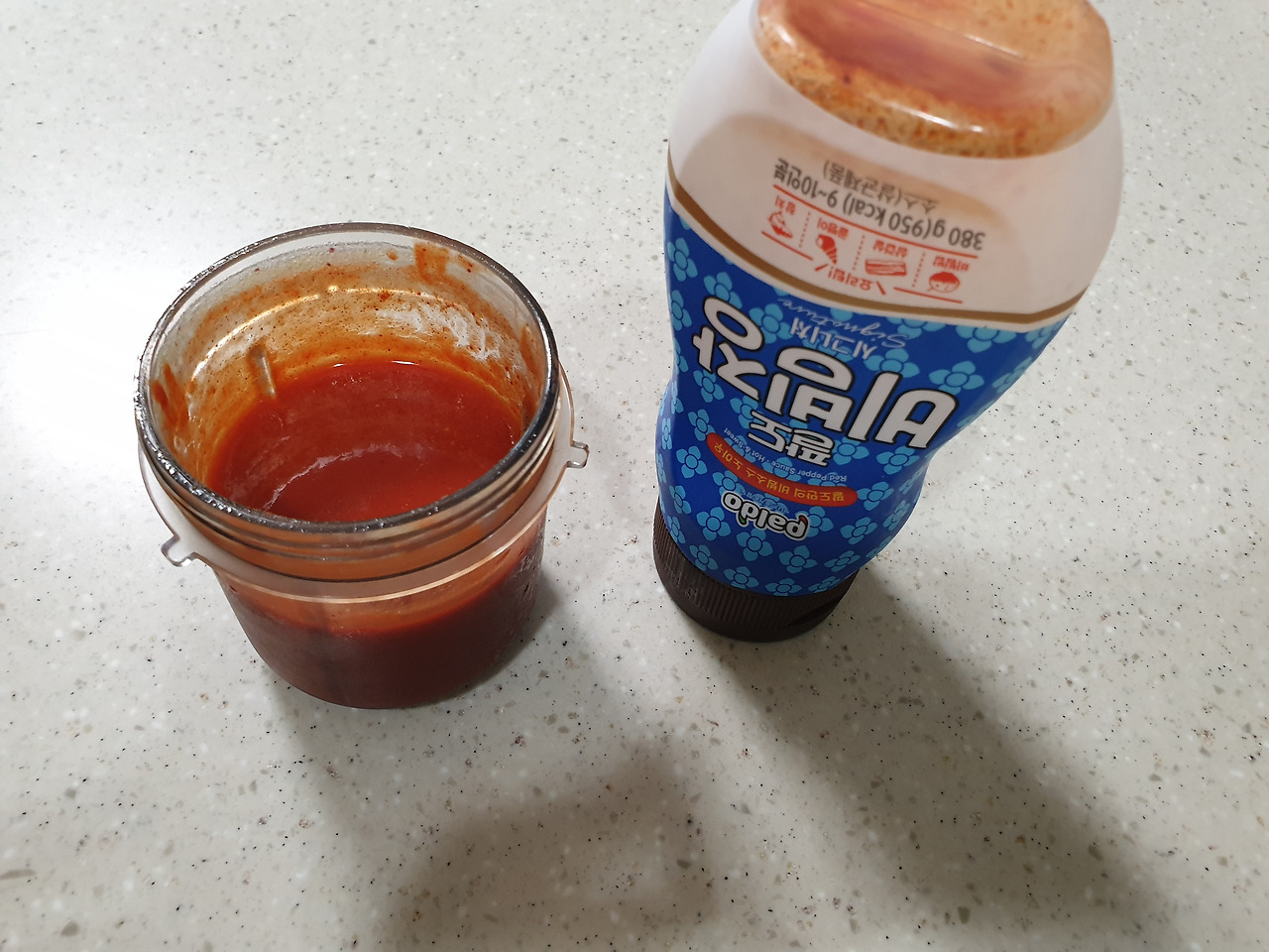 파인애플 남은 양에 팔도비빔장을 더하고 더해서 적당한 농도를 맞춰준다. 싱거우면 쯔유 한스푼, 신맛이 덜하면 식초 한스푼, 밍밍하면 다시 팔도 비빔장.