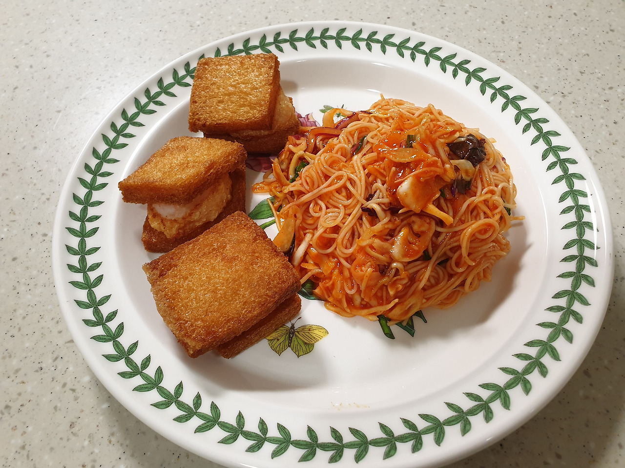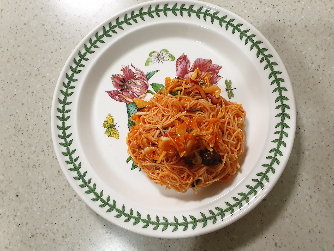 매콤새콤한 비빔국수는 기름에 바싹 튀긴 멘보샤랑 잘 어울릴 것 같았다. 그리고 지친 월요일에도 딱일듯. 그래서 국수 삶기 전에 멘보샤부터 주문했었지.