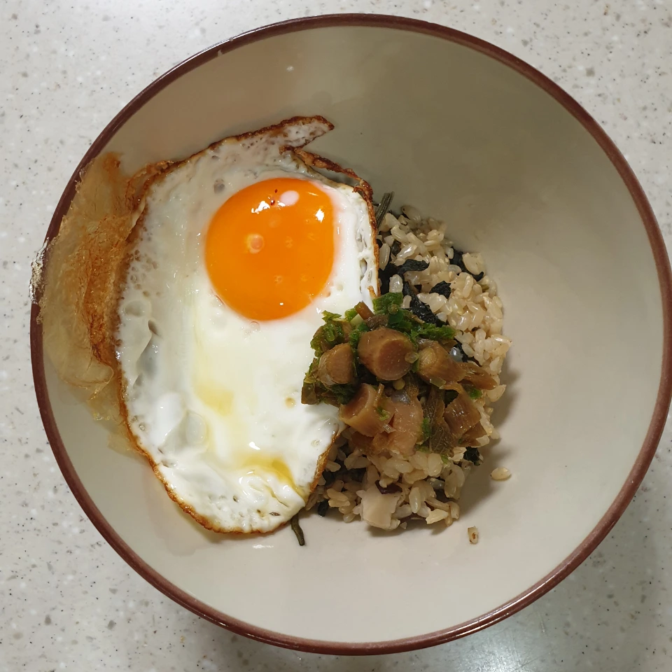 4. 밥이 다 되면 계란후라이+간장+참기름을 넣고 비벼준다. 아니면 계란후라이+간장+버터도 좋다.