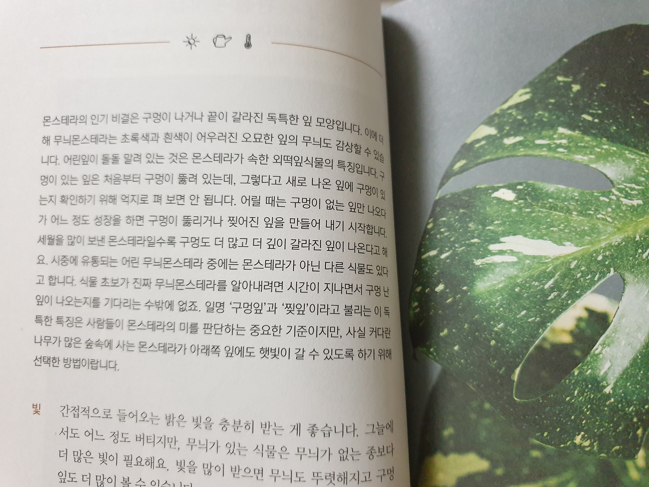 "일명 구멍잎과 찢잎이라고 불리는 이 독특한 특징은 사람들이 몬스테라의 미를 판단하는 중요한 기준이지만 사실 커다란 나무가 많은 숲속에 사는 몬스테라가 아래쪽 잎에도 햇빛이 갈 수 있도록 하기 위해 선택한 방법입니다."