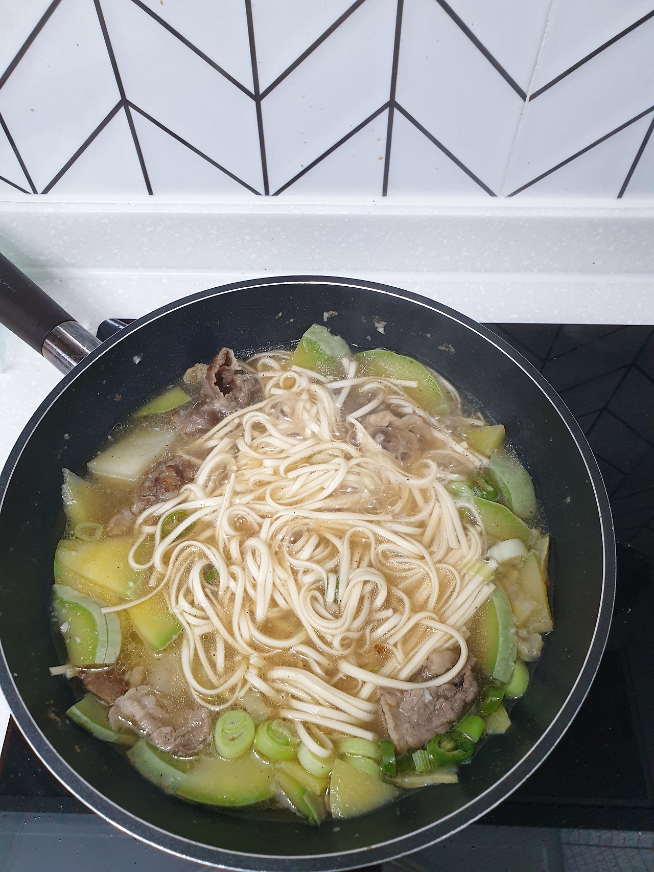 면이 달라붙지 않게 가끔 저어준다. 국물이 끓으면 파 한줌, 청량고추 한줌 넣고 다시 한소끔 끓여준다.