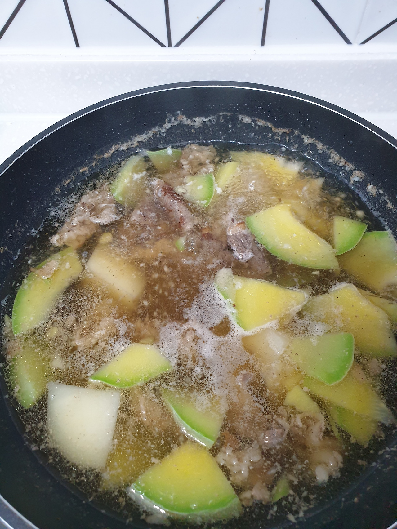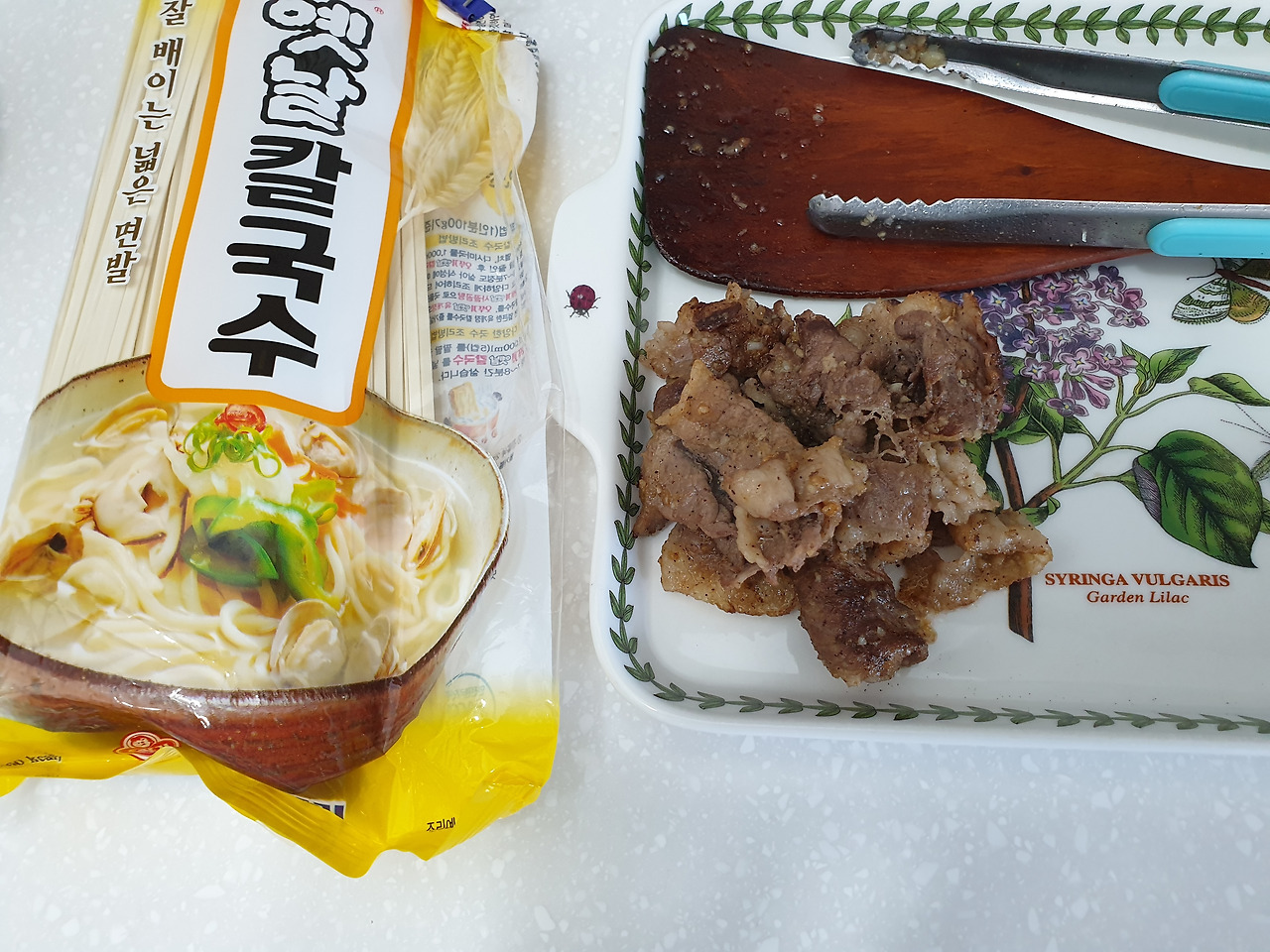 육수를 따로 사용할 필요는 없지만 우거지국 끓이기 위해 우려놓았던 북어 육수가 있어서 사용하였다. 칼국수 전문점에서 차돌은 따로 볶아 고명으로 사용하길래 차돌은 접시에 따로 담아두고 차돌볶은 팬만 국물 끓이는데 사용하려고 했더니 맹물 아니고 따로 우려낸 육수를 사용했는데도 국물에서 깊은 맛이 덜하다. 그래서 차돌도 다시 국물 속으로 투하. 시골호박을 넙적하게 썰어서 육수, 볶아낸 차돌과 함께 차돌을 볶아내었던 팬에다 팔팔 끓였다. 칼국수면은 건면을 사용하였다. 생면을 사용하면 더 쫄깃한 식감을 느낄 수 있지만 깔끔한 국물맛을 위해 면을 따로 삶아 내어야 하고, 간이 잘 베지 않아서 맛있게 끓여내기가 쉽지 않다. 무엇보다도 생면은 유통기한이 짧아서 사다 놓으면 제대로 못 먹고 버리기 일쑤다. 그래서 장볼 때 집었다가 다시 놓으면 필요할 때 없다. 어쩌다 사다 놓은 칼국수면이 있으면 유통기한이 한참 지나서 못 먹는다.