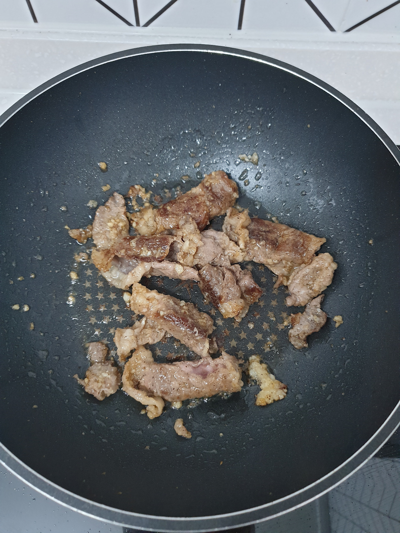 차돌이 어느 정도 익어가면 간마늘 반 숟가락을 같이 볶아준다. 간마늘은 탈 수 있으니 불을 줄이고 참기름을 같이 둘러준다. 물론 차돌기름만으로도 기름기름하지만 식물성 기름이 동물성 기름의 분해를 돕는다고 하니 참기름이나 들기름을 적당히 넣어주는 것이 건강에도 도움이 된다.