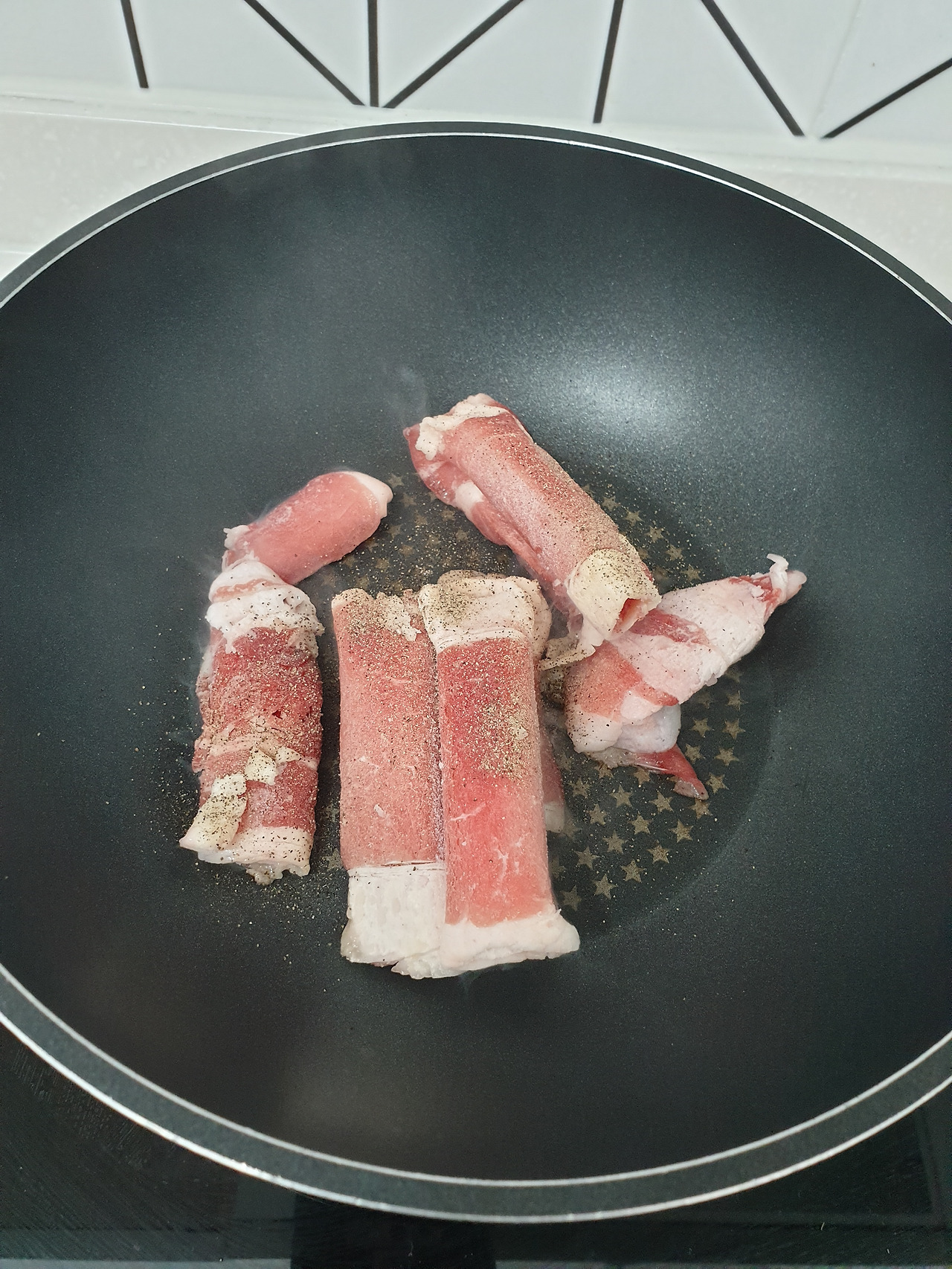 달군 팬에 후추로 밑간한 차돌을 볶는다. 소금간도 해주면 차돌이 더 맛있을 것 같지만 국물간이 베이고 김치를 곁들일테니 나트륨 섭취를 줄이기 위해 후추 밑간만 했다.