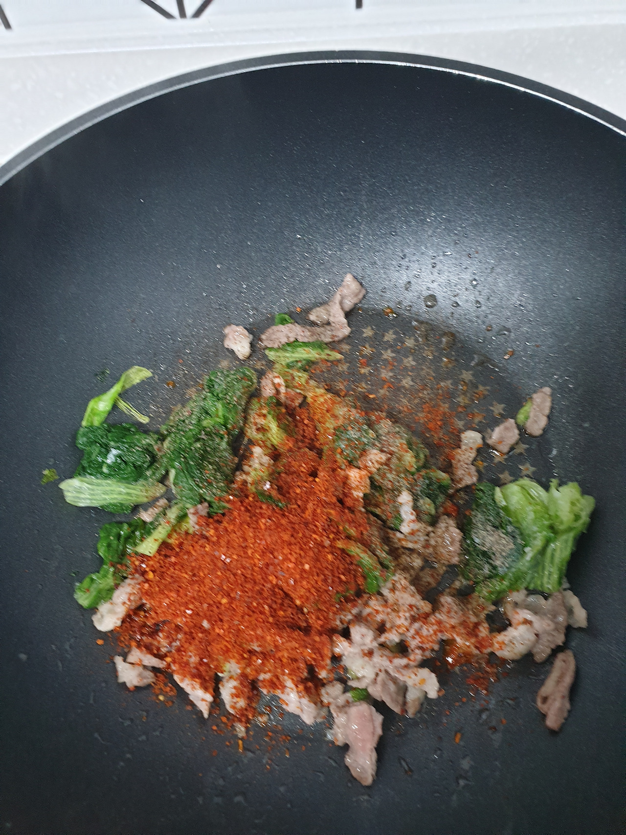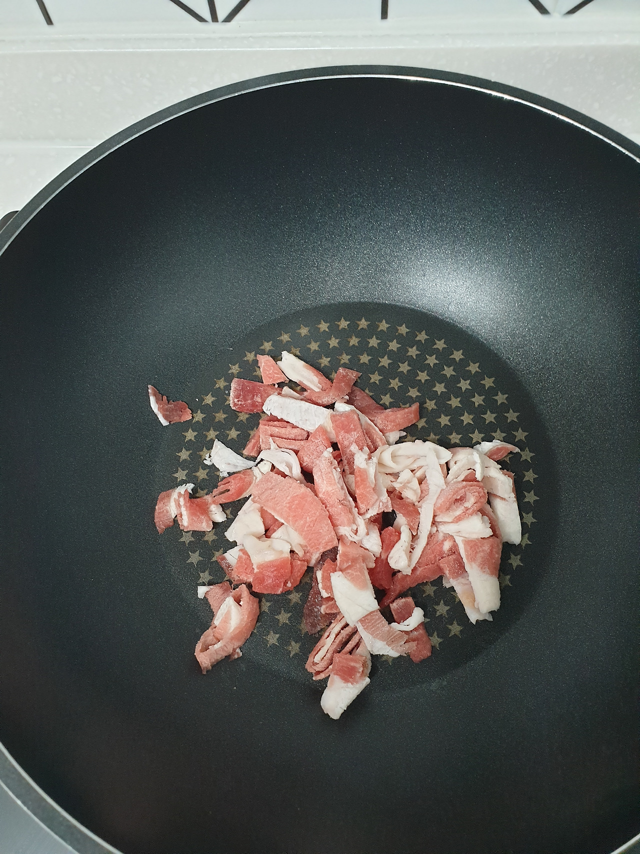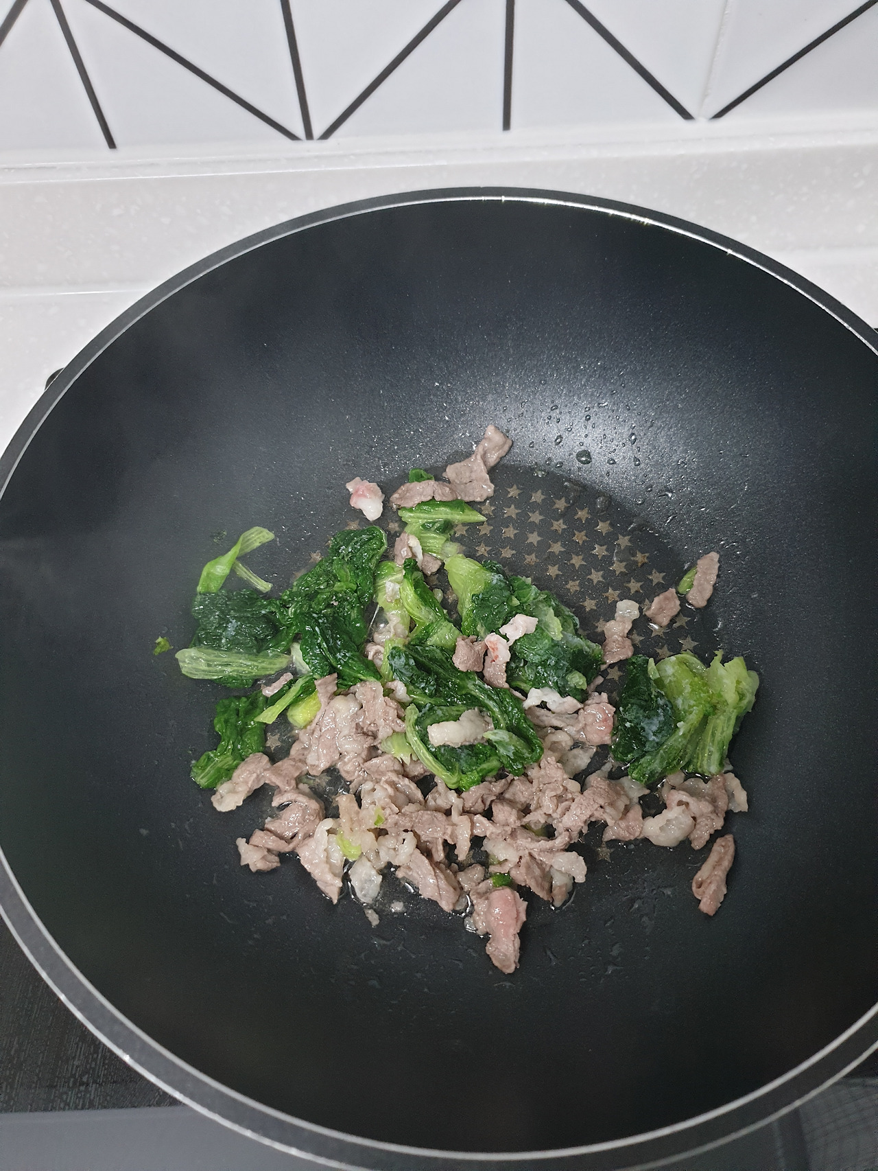 차돌을 잘게 썰어 볶다가 고소하게 기름냄새가 올라오면 우거지 한 줌, 간마늘 한 숟가락 넣고 잘 볶는다. 따로 기름을 넣지 않아도 차돌기름에 우거지까지 잘 볶인다.