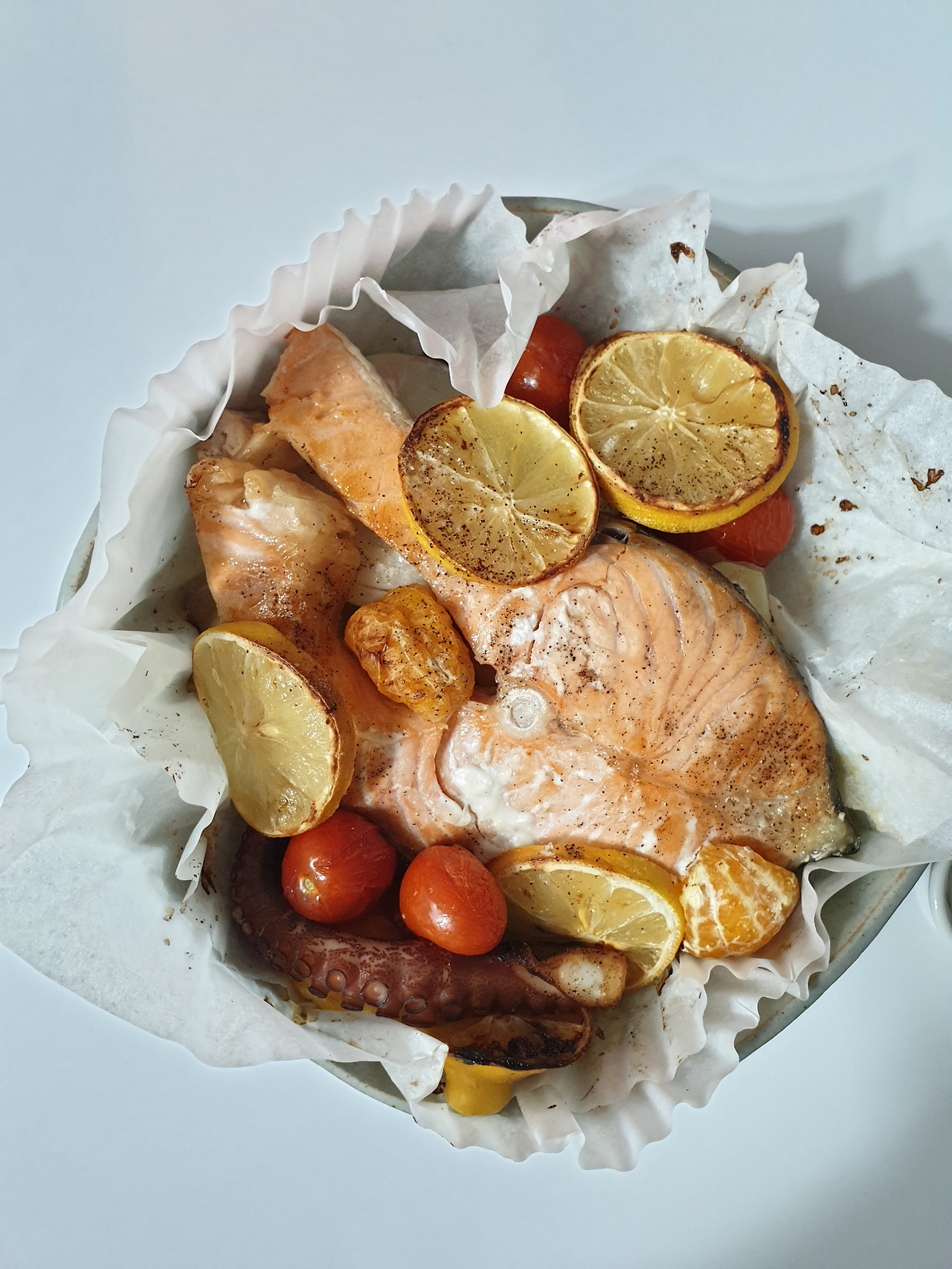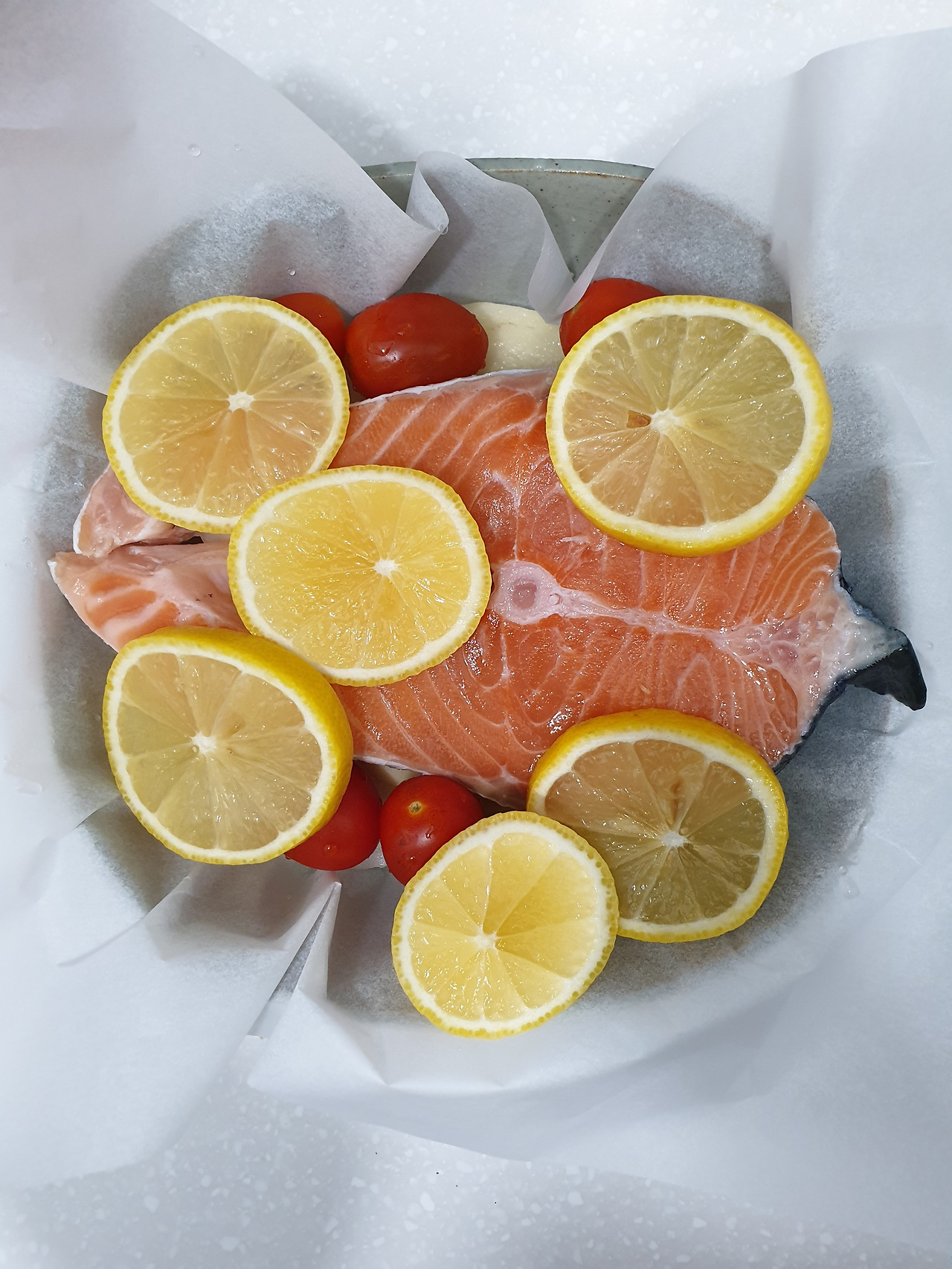 만드는 법은 초간단이다. 종이호일을 깔고 가장 아래 양파와 감자, 그 위에 연어를 통으로 올리고 방울토마토, 레몬 슬라이스로 덮어준다. 레몬 슬라이스로 연어를 덮어주기 전에 연어는 소금&후추 간을 해준다. 그리고 올리브유를 두 스푼 정도 둘러주고 화이트와인을 넉넉히 둘러준다. 화이트와인은 새콤한 맛이 베이니까 기호에 맞게 양을 조절하면 된다. 연어가 기름기가 많고 자칫 냄새가 강할 수 있으니 개인적으로는 화이트와인의 새콤한 맛이 좋았지만 신맛이 싫은 사람들은 서너 스푼 정도면 괜찮을 듯하다.