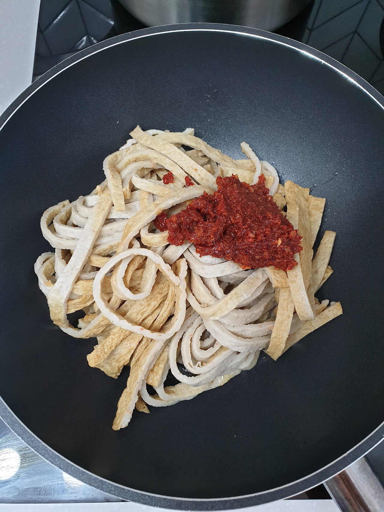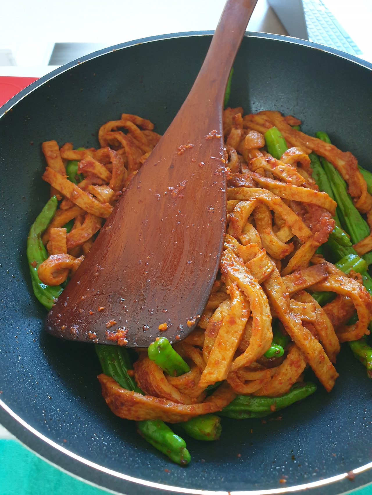 어묵 양념은 간 마늘 1, 고춧가루 5, 간장 3, 맛술 2, 생강큐브 2(없으면 생략, 간마늘로 충분하다). 깊은 팬에 기름을 두르고 어묵을 양념과 함께 잘 볶아준다. 양념은 자칫하면 탈 수 있으니 기름을 더하고 불을 줄여준다. 맛을 보고 조금 짜다 싶게 간을 해준다. 꽈리고추는 어묵이 거의 다 볶아졌을 때, 불 끄기 30초 전에 넣고 살짝만 볶아준다.