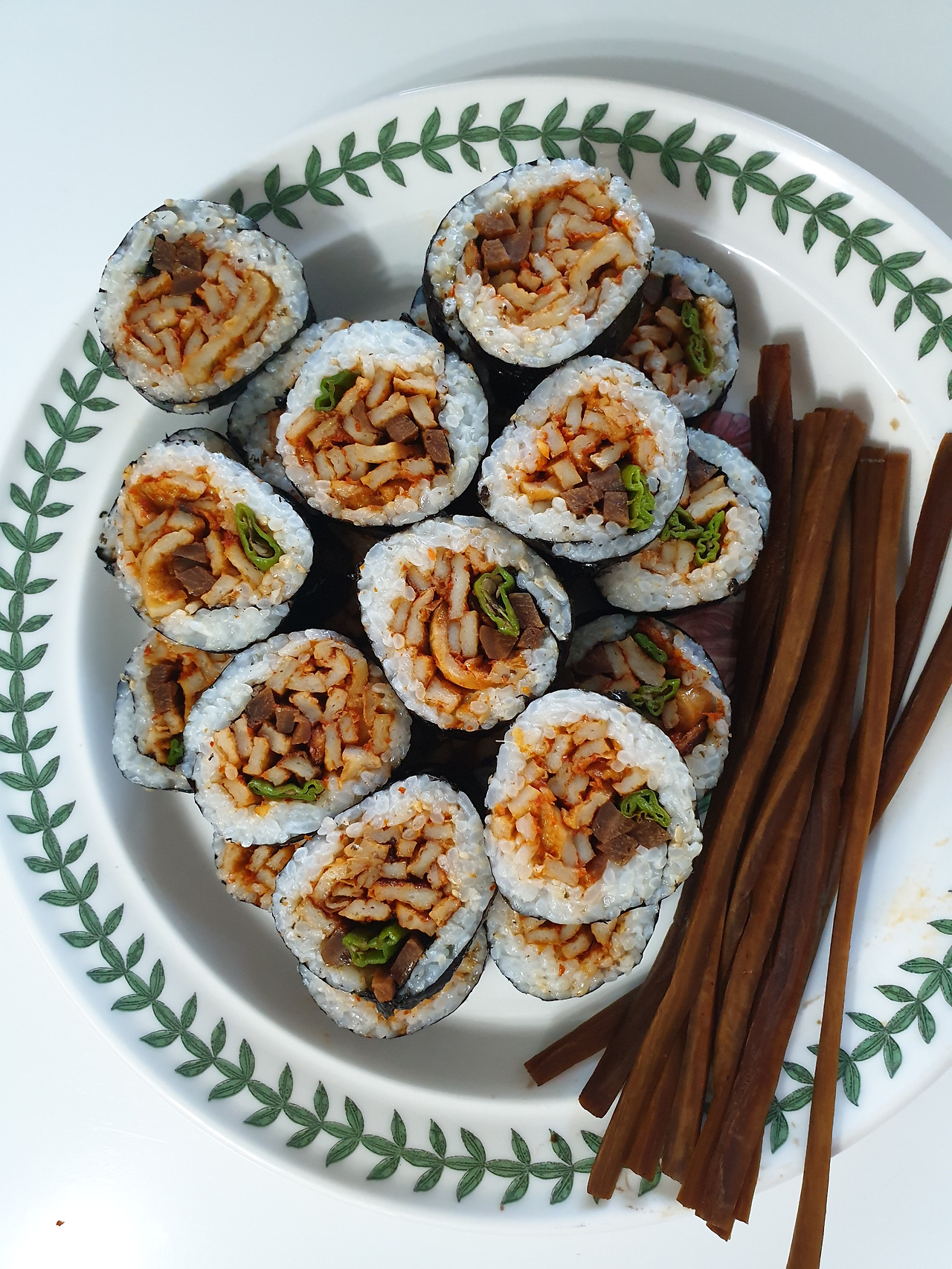 김 위에 밥을 펴고 어묵을 듬뿍, 같이 조리한 꽈리고추 두 개를 한 줄로 놓고 조린 우엉 세 개를 나란히 올린다. 그리고 김발로 말아준다.