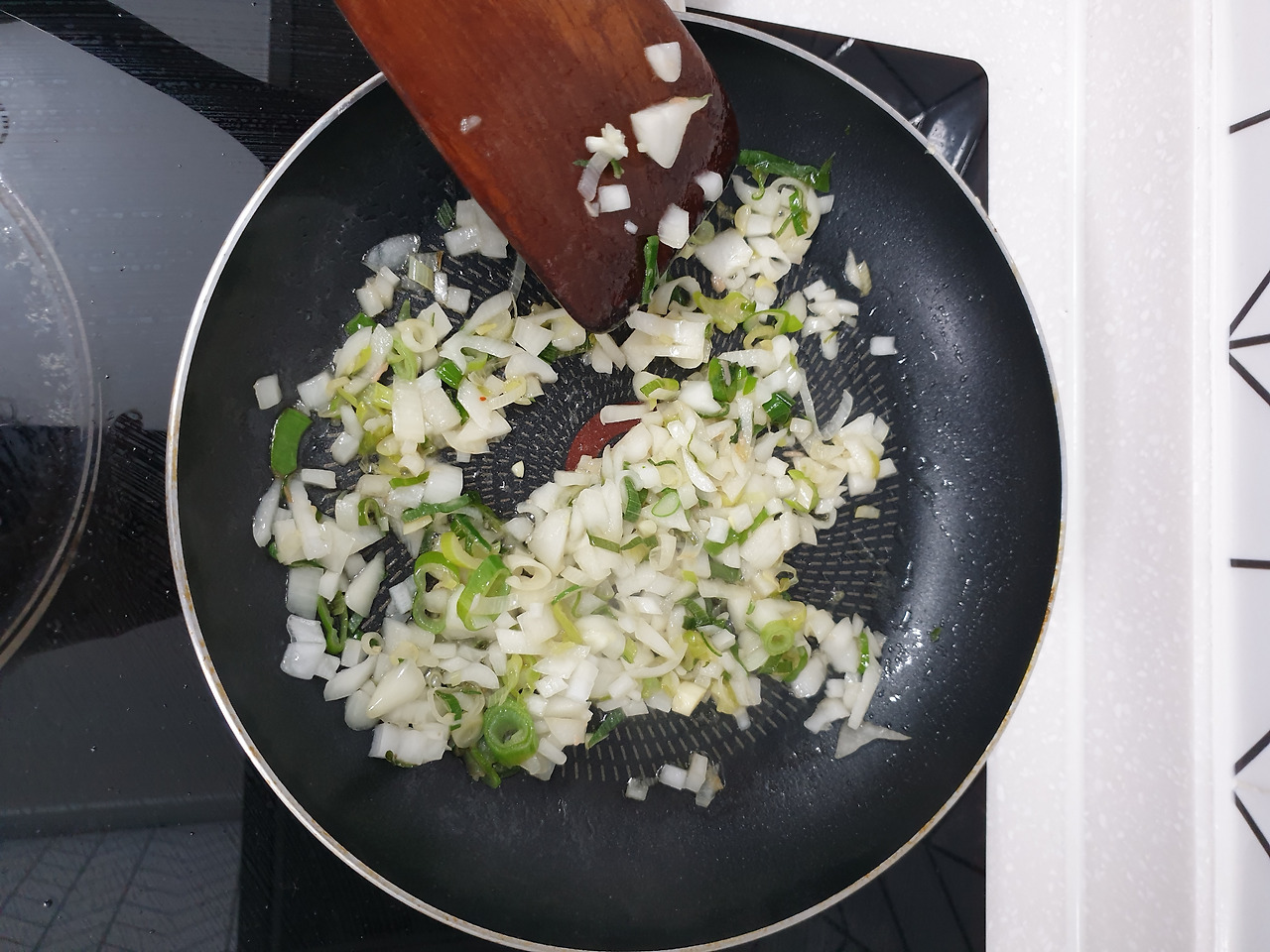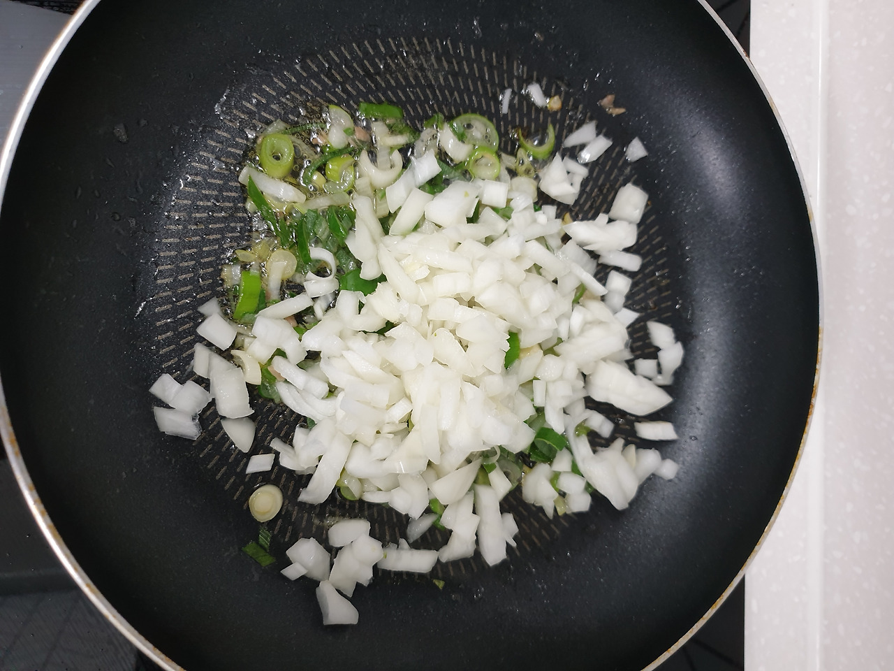 파기름이 어느정도 나왔다 싶으면 양파도 같이 볶아준다. 양파가 투명할 때까지 볶아서 양파향을 풍부하게 해준다.