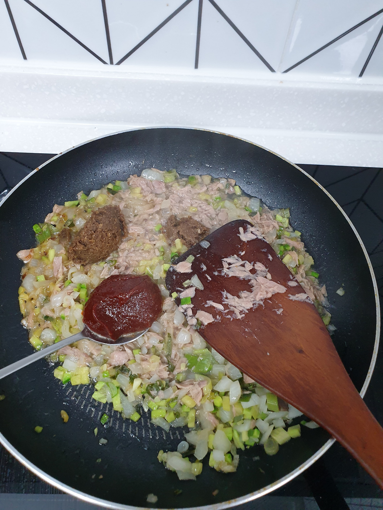 그 다음 호박, 호박이 익으면 참치를 넣어준다. 귀찮으면 한꺼번에 볶아도 되지만 순서대로 볶으면 재료들 각자의 맛이 더 살지 않을까 기대해 본다.