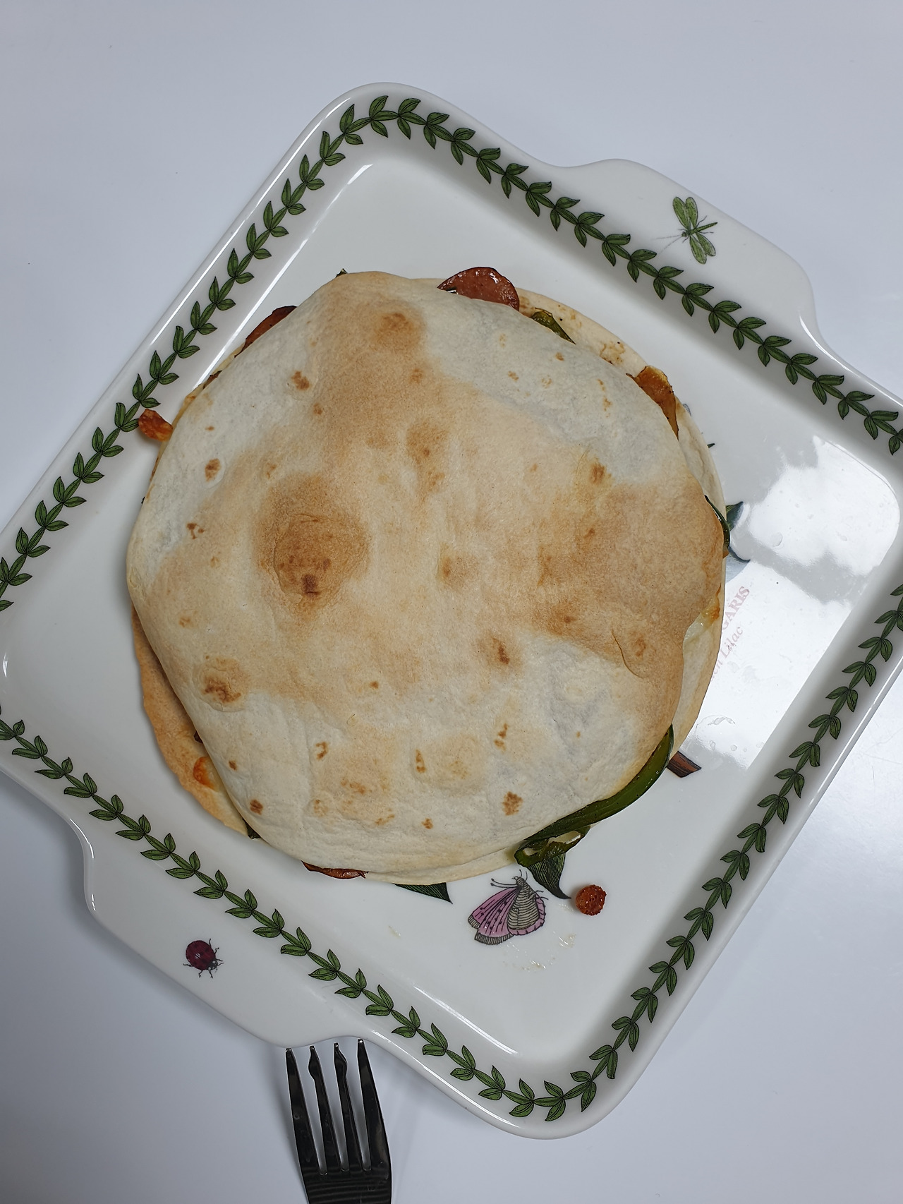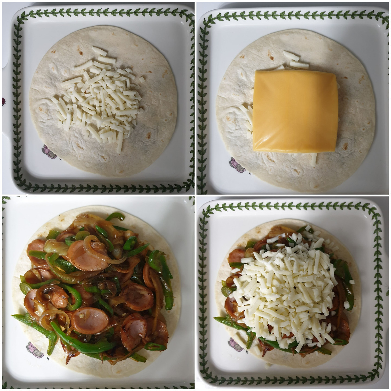 토르티야에 모차렐라 치즈-체다치즈-볶은 야채와 소시지-다시 모차렐라 치즈-다시 토르티야 순서대로 잘 쌓아준다.