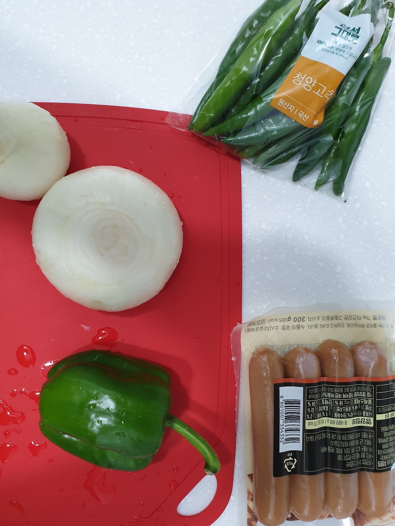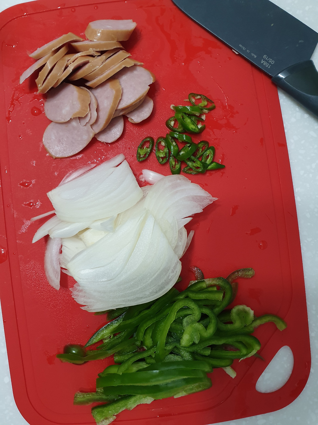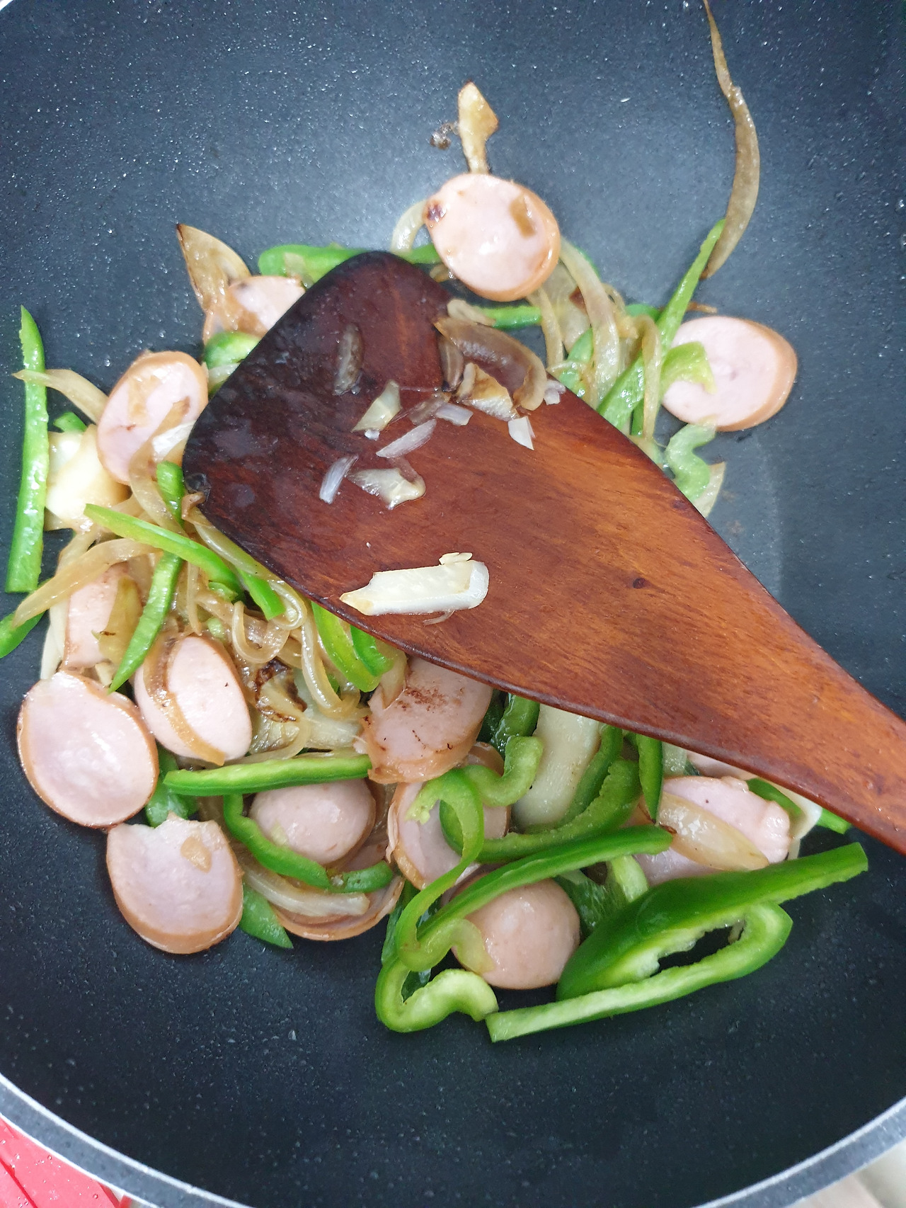 먼저 양파 1/4, 피망 한 개, 양배추는 조금(양파 양과 같거나 그보다 적게, 없으면 생략), 소시지를 채 썰어서 볶는다. 순서는 양파, 양배추, 피망, 소시지 순서로. 어차피 에어프라이어에 한 번 더 구울 거라 귀찮으면 한꺼번에 다 볶아도 상관없다. 그리고 굴소스 한 스푼 넣고 15초만 더 볶아준다.