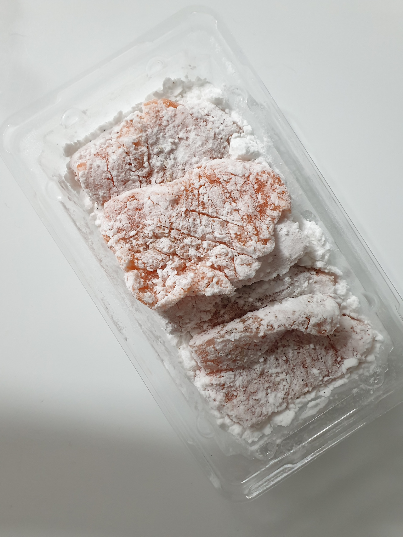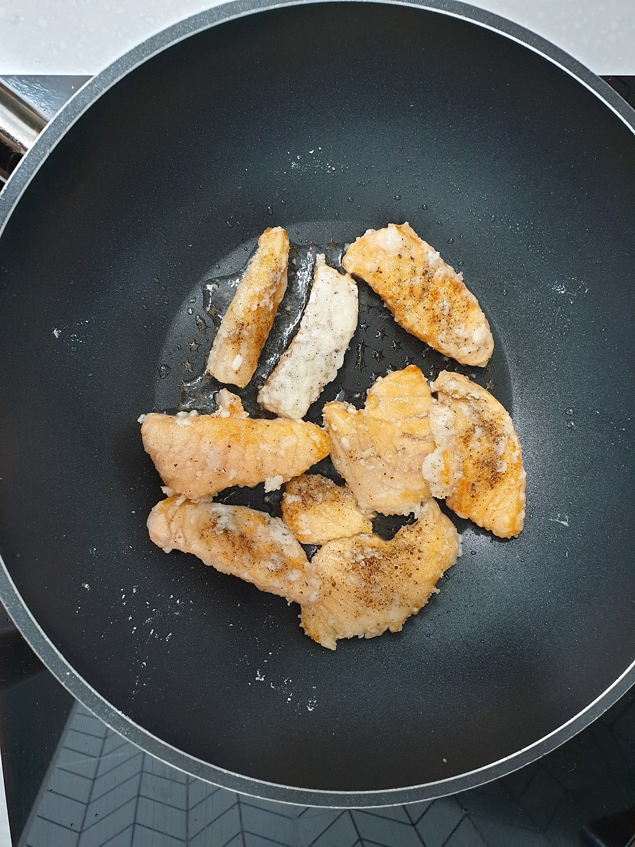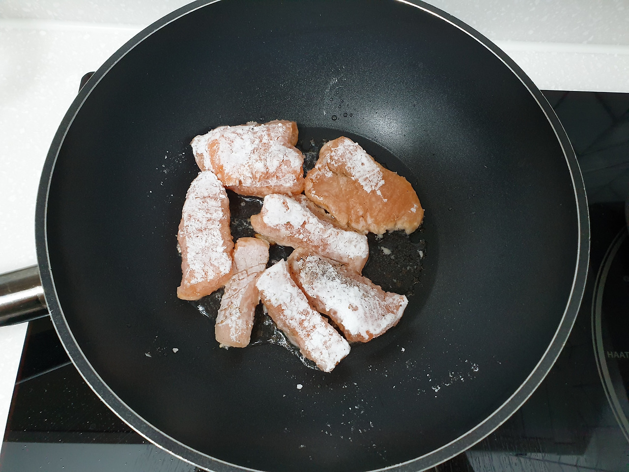 아무튼 남은 연어를 소금, 후추로 밑간해서 전분가루를 입혀둔다. 굴소스에 한번 조릴 것이므로 소금은 아주 소량만. 하지만 굴소스를 사용하지 않을 것이라면 간이 맞게 밑간을 해준다. 전분가루는 앞뒤 적당히 입히고 튀기기 전에 한번 털어준다. 치킨 튀기듯이 아주 꼼꼼하게 입혀줄 필요는 없지만 전분을 입혀주면 연어의 느끼한 맛이 살짝 잡히면서 튀겼을 때 고소해 진다. 전분 입힌 연어는 기름을 넉넉히 두르고 센불에 튀겨준다. 타지 않도록 불을 줄이는 게 아니라, 기름을 넉넉하게 둘러서 센불에 튀겨야 겉바속촉으로 튀겨진다.