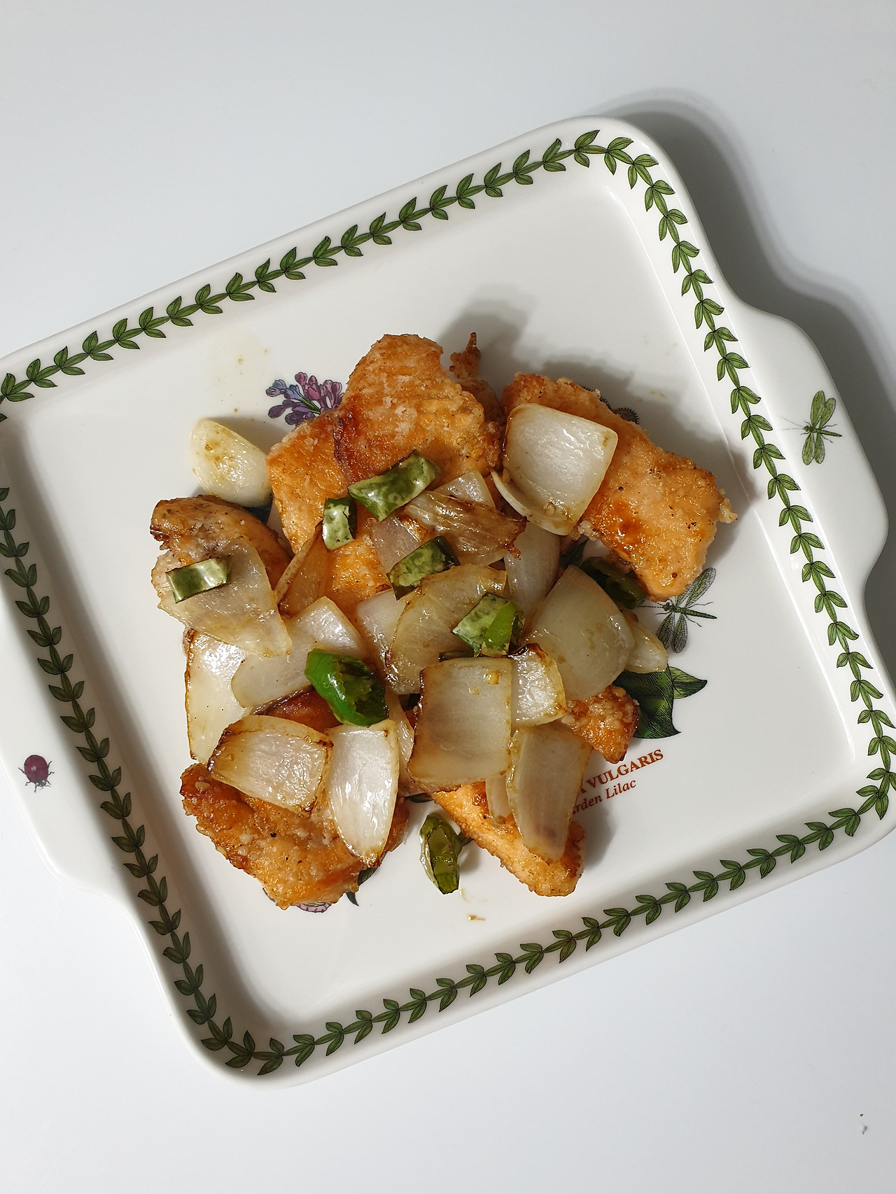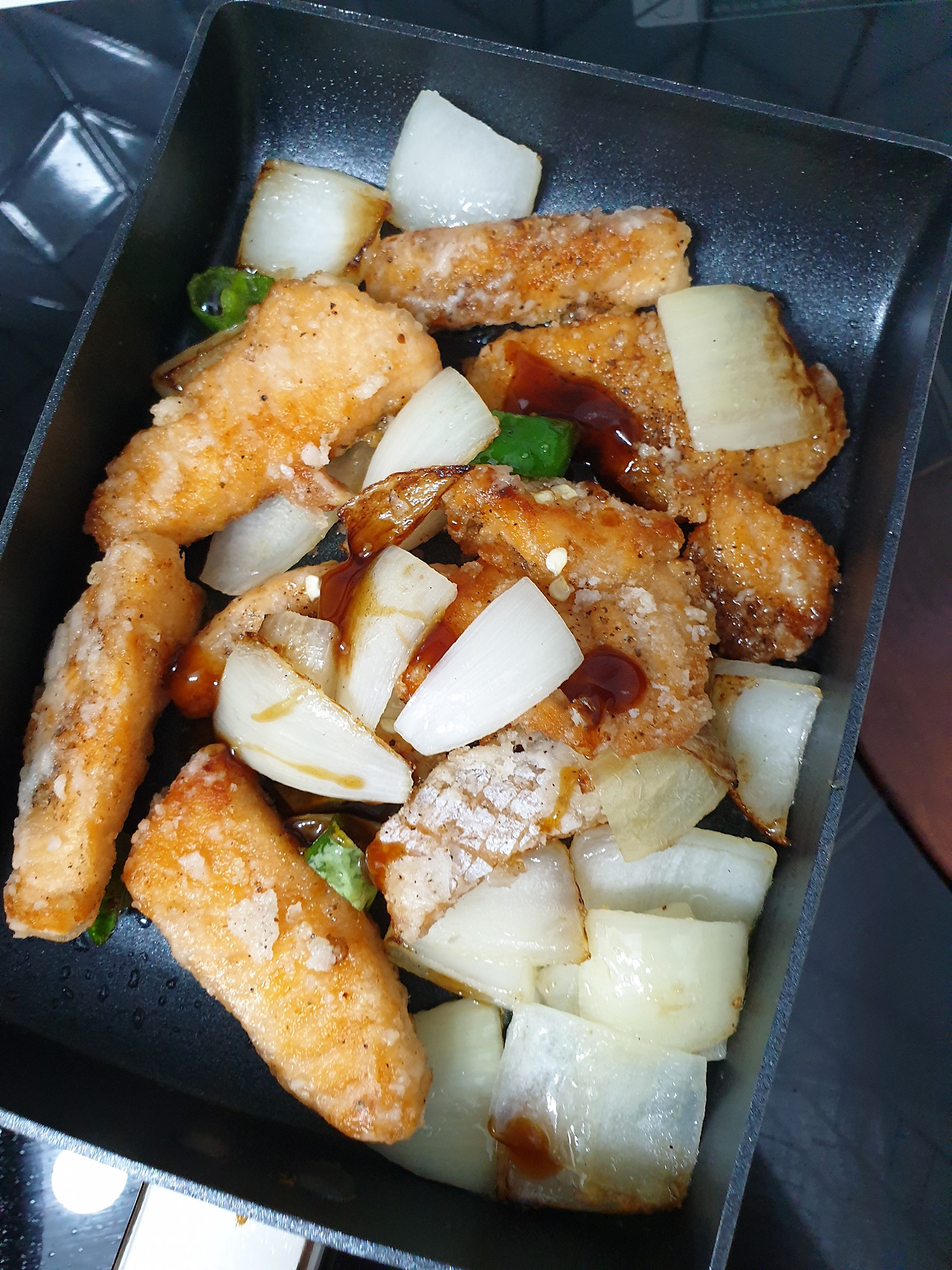 - 재료 : 연어 사시미 크기로 8-9개 정도, 후추, 소금, 감자전분, 양파, 청양고추, 굴소스