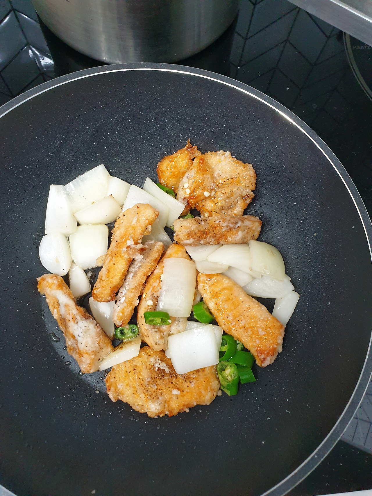 노릇노릇하게 잘 구워지면 양파와 청양고추를 같이 볶아준다. 양파가 너무 물러지지 않고 아삭한 식감이 남을 정도로 매운 맛만 날려준다는 기분으로 볶아준다.