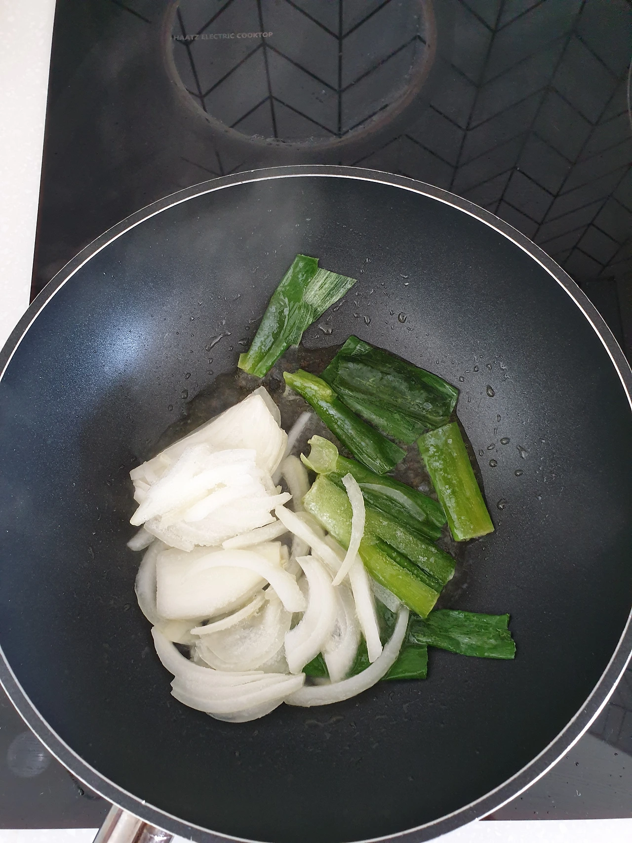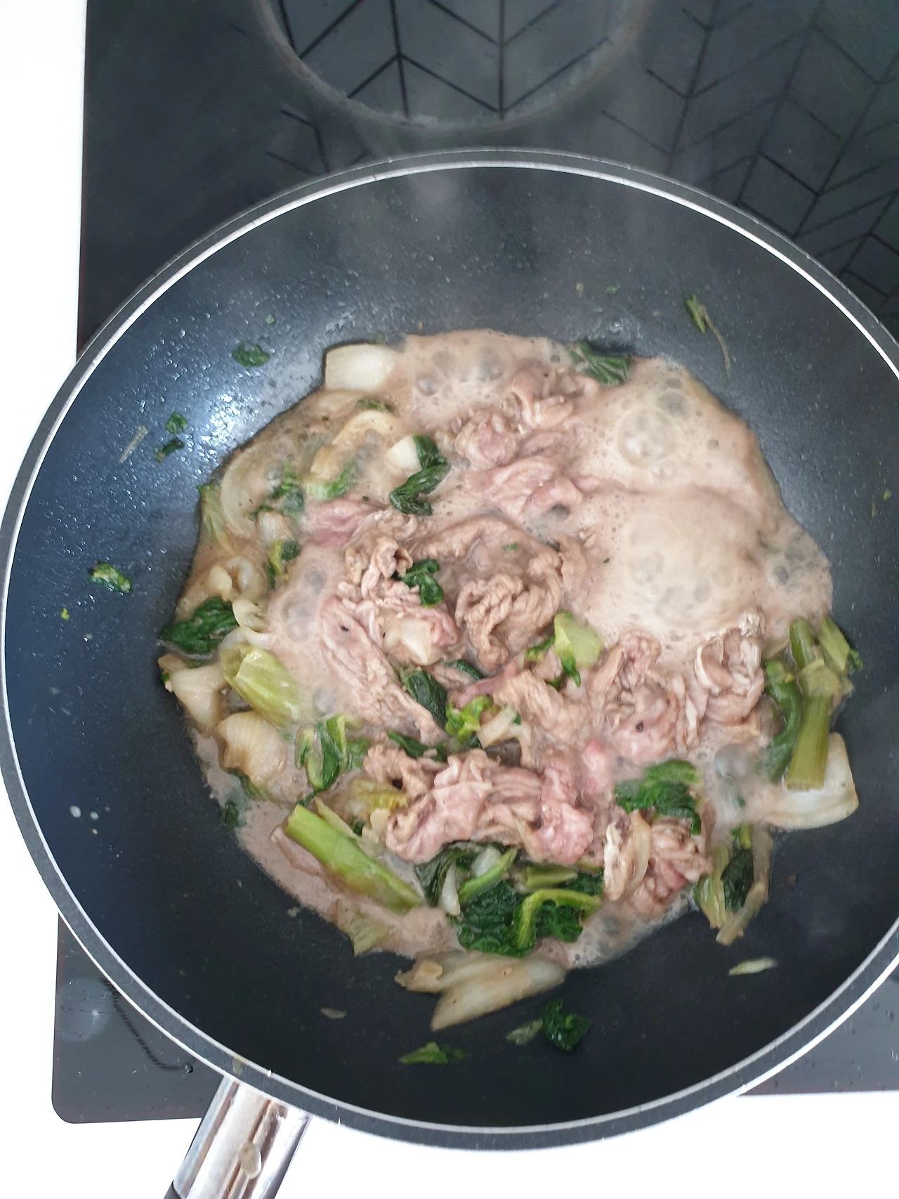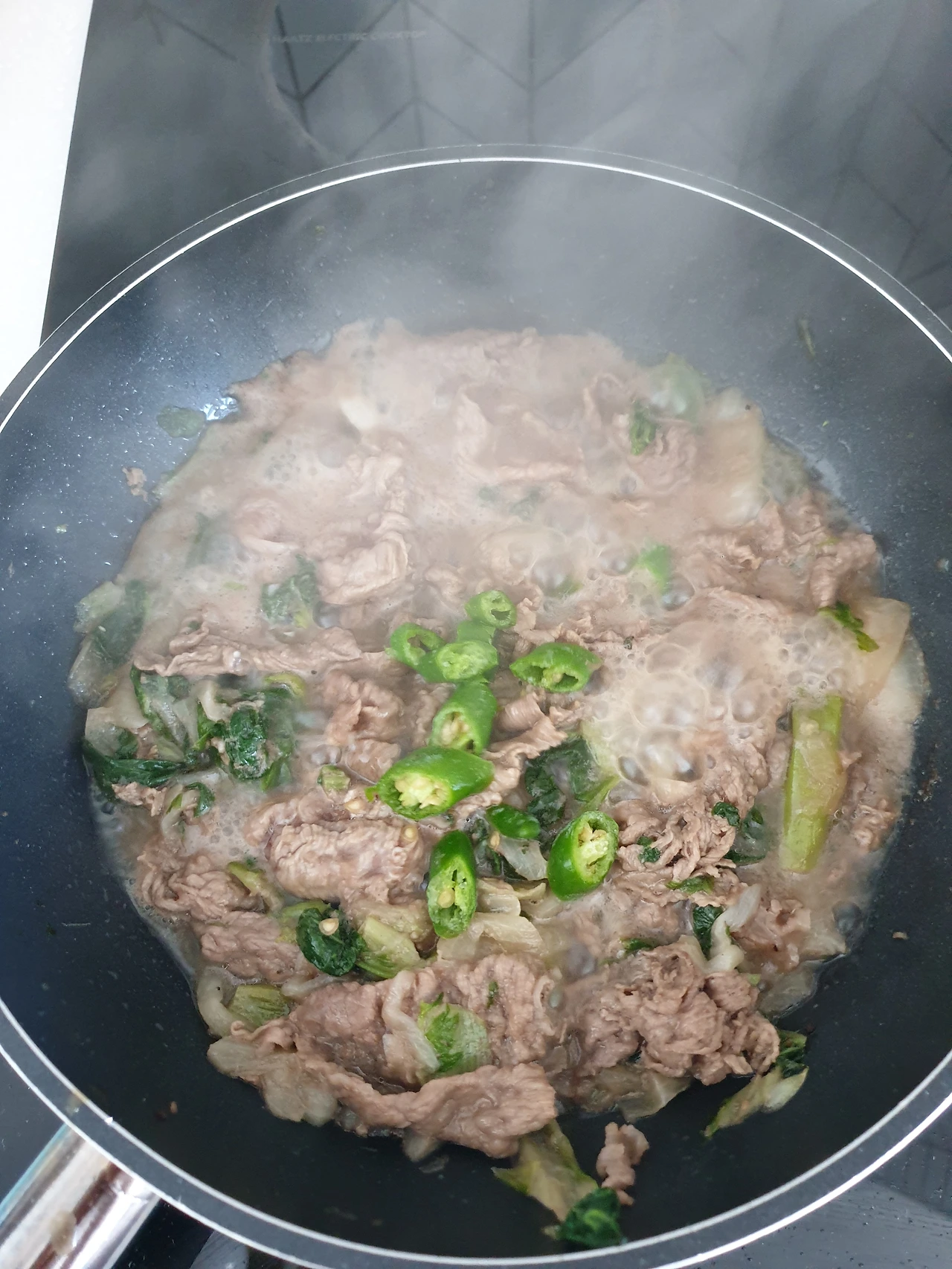 깊은 팬에 올리브유를 두르고 대파와 양파를 볶는다. 야채가 어느 정도 물렀으면 30분 정도 재운 소고기를 넣고 볶는다. 나는 냉동실에 보관 중이었던 야채를 사용해서 미리 물러질 때까지 볶았지만 신선한 야채는 식감을 살려 쓰는 것도 좋을 것 같다. 고기를 볶으면서 간장 2-3 스푼 넣어준다. 국물 맛을 봐가며, 짜지 않도록.